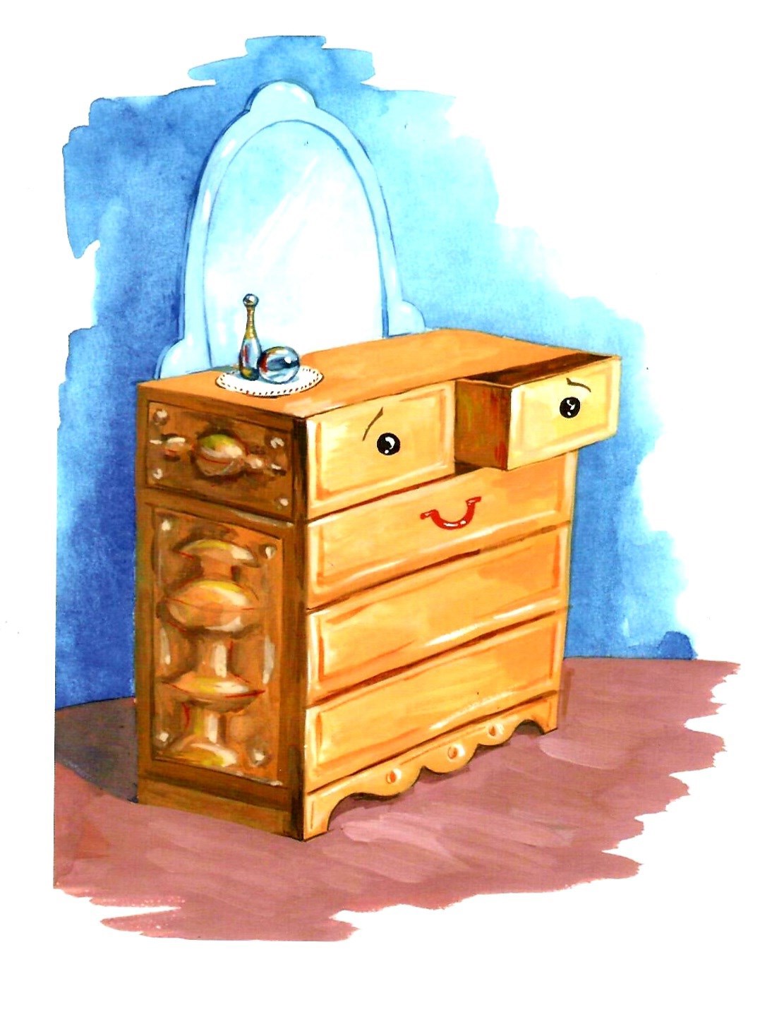 Оформление страницы со стихотворением Ольги КАН "Комод" из поэтического сборника для детей "Ух ты!" (г. Барнаул, 2014 год., изд. "Алтайский дом печати"). Текст стихотворения: