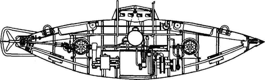 Двигатель был живой. Все члены экипажа работали на педалях, вращая два гребных винта - носовой и кормовой. Причём кормовой мог поворачиваться в горизонтальной плоскости для изменения курса, а носовой — в вертикальной плоскости, опуская или поднимая нос лодки. Скорость хода достигала 3 узлов, что для мускульного привода было очень хорошо. Да и моторы, как мы увидим, не шибко превосходили этот подводный велосипед.