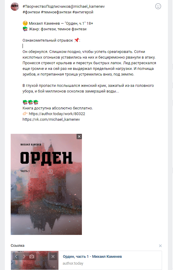 Все просто: закидываете мне в предложку сообщества пост с Вашей книгой/артом/текстом/рассказом/новостью о выходе. Я также продублирую это в своем инстаграме. Все бесплатно, естественно.
