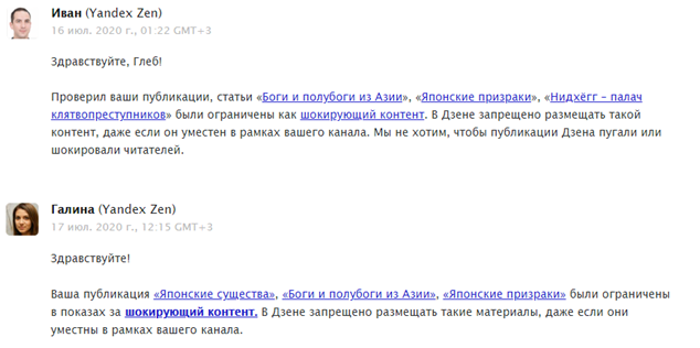 За время нахождения и публикаций на сайте постоянно писал в службу поддержки Дзена. Ни один вопрос фактически не решили. Постоянно отписки однотипные. Несколько случаев было, когда на один и тот же перечень постов мне показывали разные посты с ограничениями. То есть это как? Система каждому сотруднику показывает, что на разных постах ограничения? Получается, сотрудники Дзена даже не могут посмотреть на статью и ограничения посмотреть?
