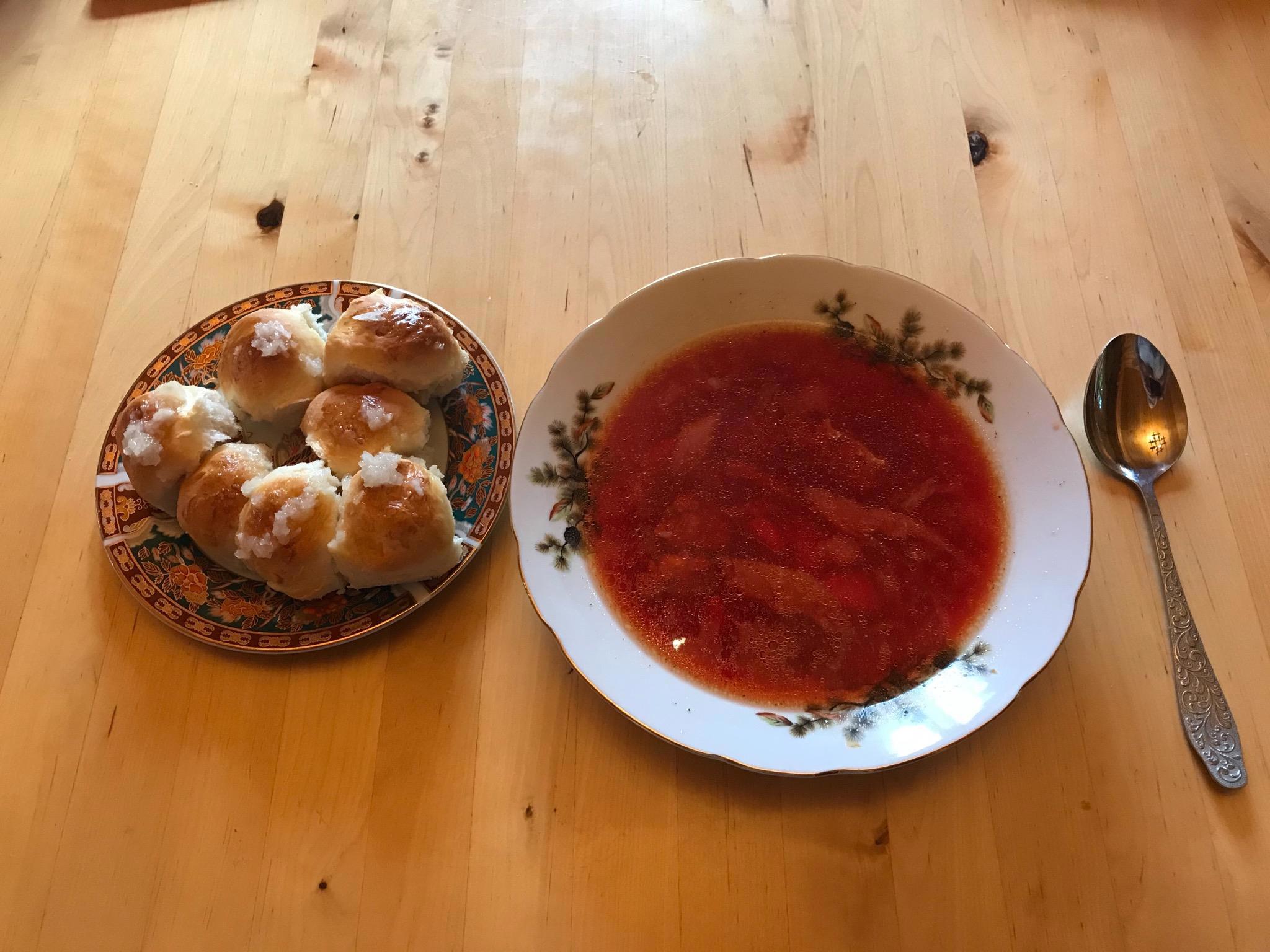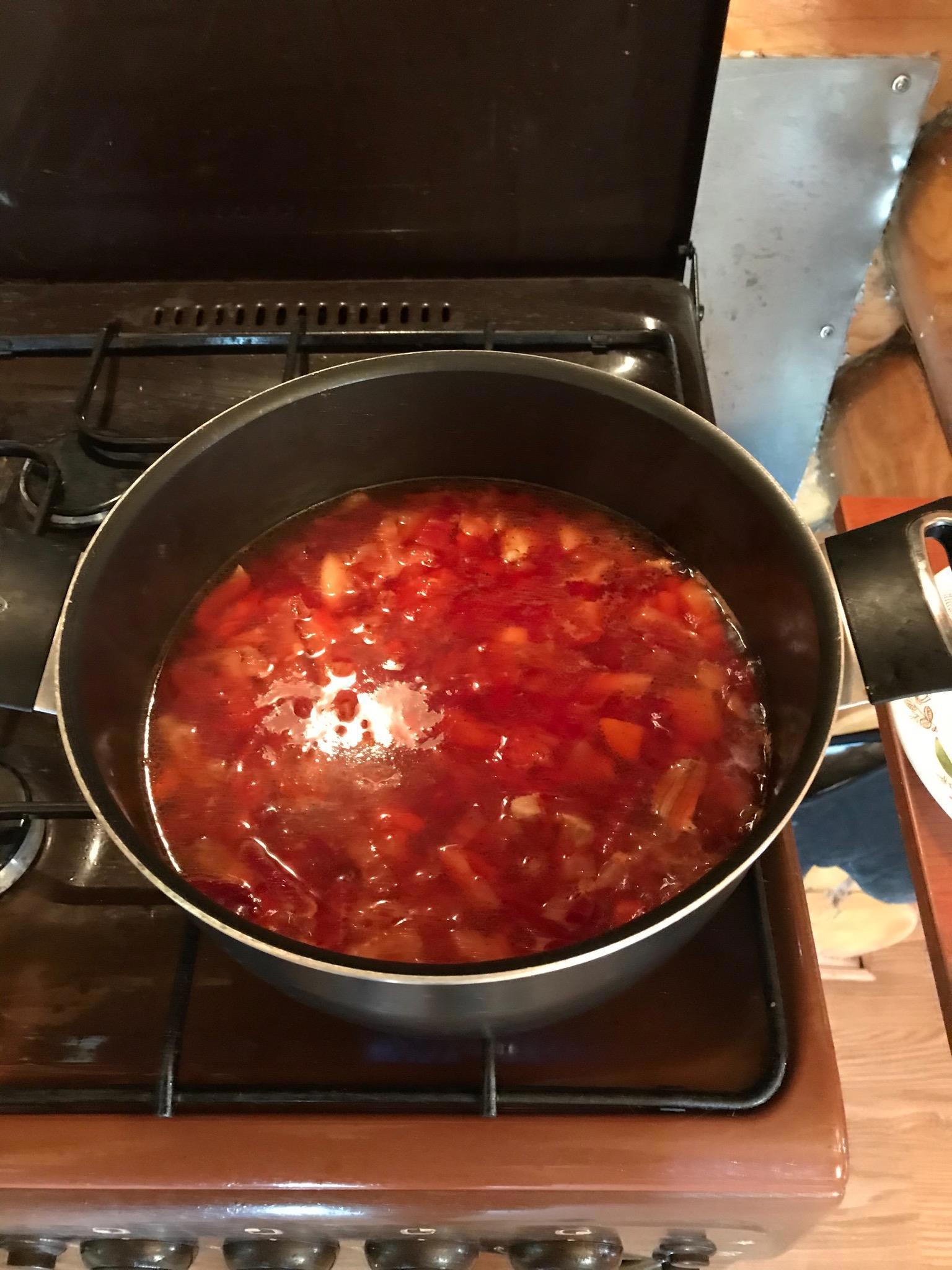 Добавлять в бульон последовательно: сначала капусту, потом картошку и чеснок, в последнюю очеоредь свеклу, морковь и помидор.
