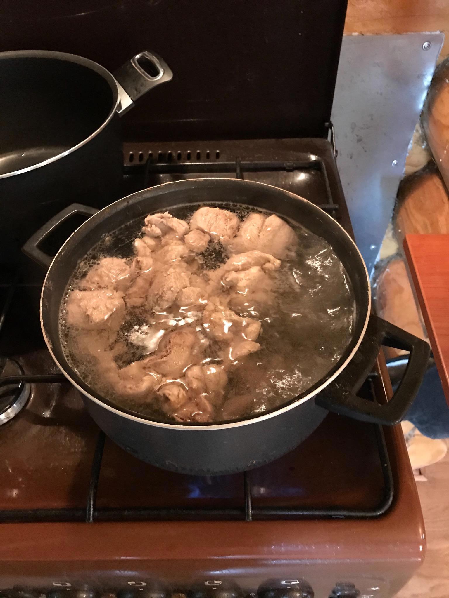 Мясо - в кастрюлю! Вообще-то, я предпочитаю использовать одновременно два вида - и свинину, и говядину - но тут у меня нашлась только свинина - обрезки от субботнего шашлыка. Зато жирная! Что ж, так тому и быть...