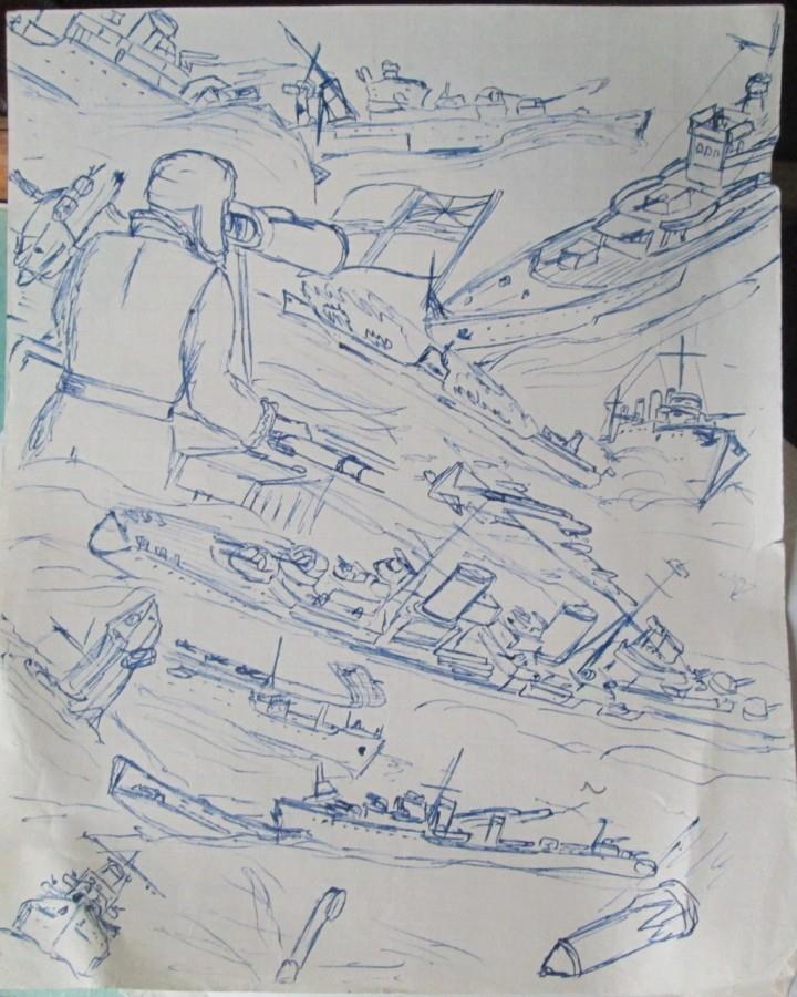 Автор: Николай Владимирович БеляевВот такой небольшой коллаж ручкой на тетрадном листочке. Нарисован между делом на лекции в институте лет 25 назад - после прочтения этой книги. Которая произвела на меня огромное впечатление и которую я до сих пор считаю чуть ли не лучшей и одной из самых страшных книг о войне на море. И, кстати, ИМХО это лучшая из книг автора. Жаль, что не экранизирована.