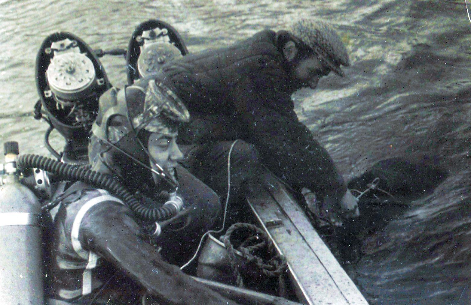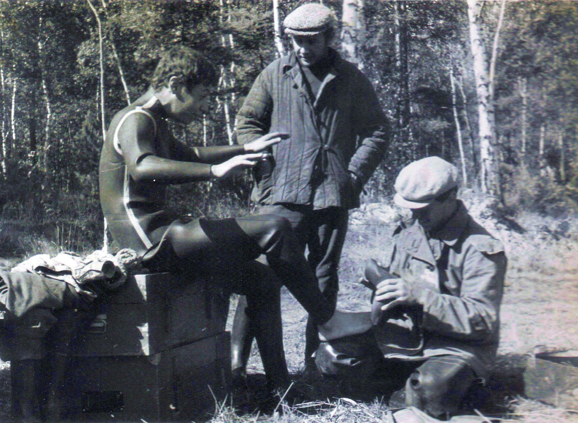 Пометили место буйком из пустой канистры. Утром я съездилл в Иркутск, в клуб, где занимался подводным плаваньем, взял акваланг и гидрокостюм. Акваланг, как сейчас помню, примитивный открытого цикла «Украина» – без редуктора, что может привезти к гибели под водой. Баллон маленький, минут на пятнадцать. Увы, любимого АВМ-1 тогда свободного не оказалось, так что рискнул. Благо, мишка затонул не на полной глубине, а метрах на двадцати. Достал со второго погружения, все таки буек в темноте ставили, ориентировочно.
