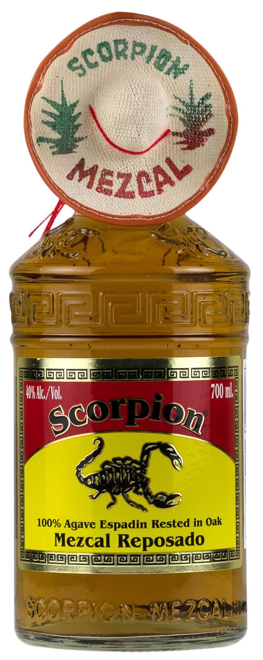 Scorpion Mezcal Reposado. 100% спиртов агавы, 40% алк. Ручное бутилирование, на каждой бутылке указан номер партии и номер конкретной бутылки. Выдерживается в дубовых бочках от 6 до 11 месяцев. Вместо «червячка Хуанито» в каждой фирменной бутылке этого мескаля с рельефным ацтекским орнаментом и изображением скорпиона содержится небольшой заспиртованный скорпион. Цвет насыщенный, янтарно-золотистый. Аромат пряный, чуть сладковатый, с нотками специй и ванили – но при этом весьма свежий. Вкус пряный, чуть маслянистый, обволакивающий и немного обжигающий, с едва заметной кислинкой и дымными нотками дуба и трубочного табака. Послевкусие долгое, пряное, горячее, чуть дымное, немного вяжущее, со вторичным согревающим эффектом.