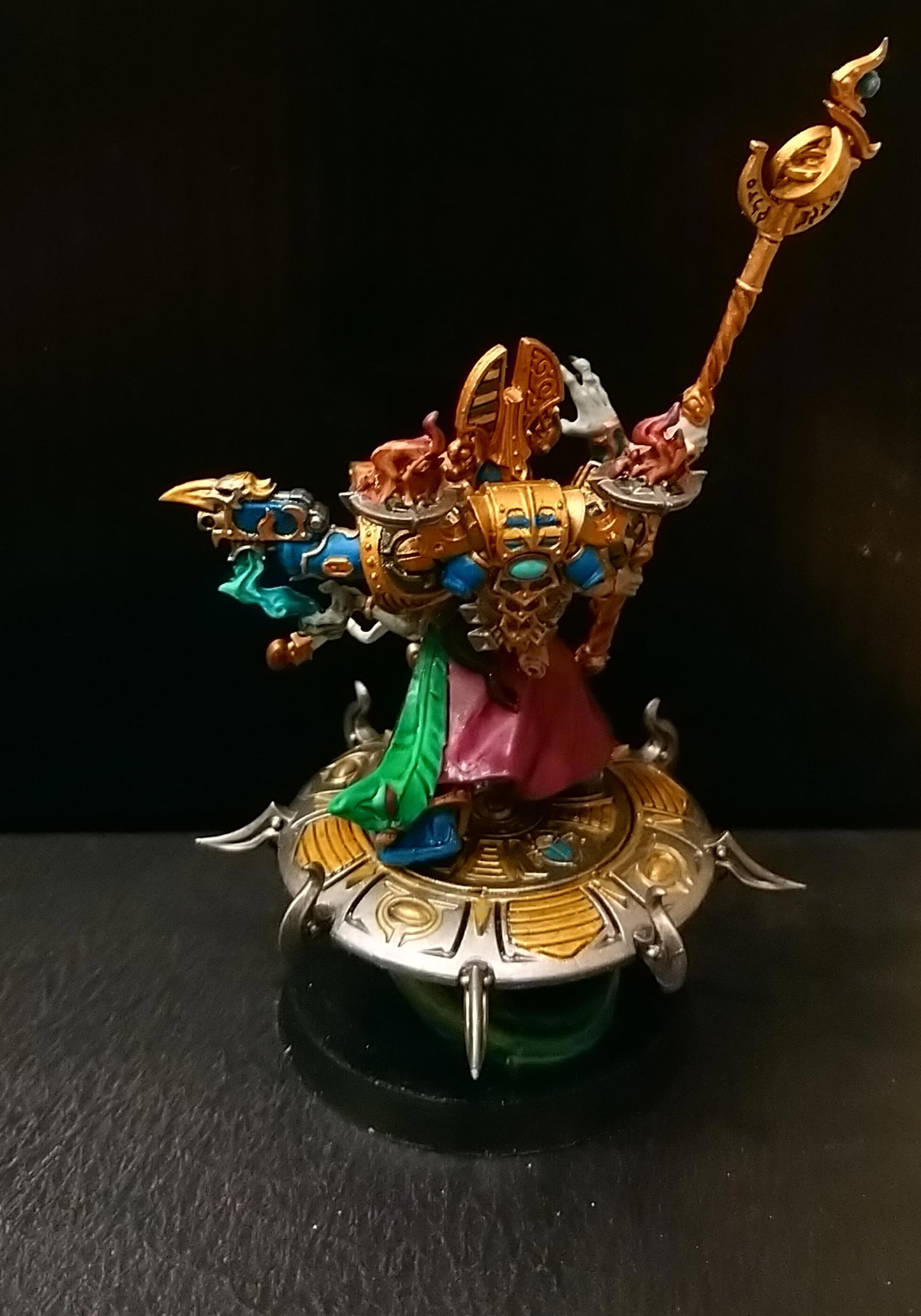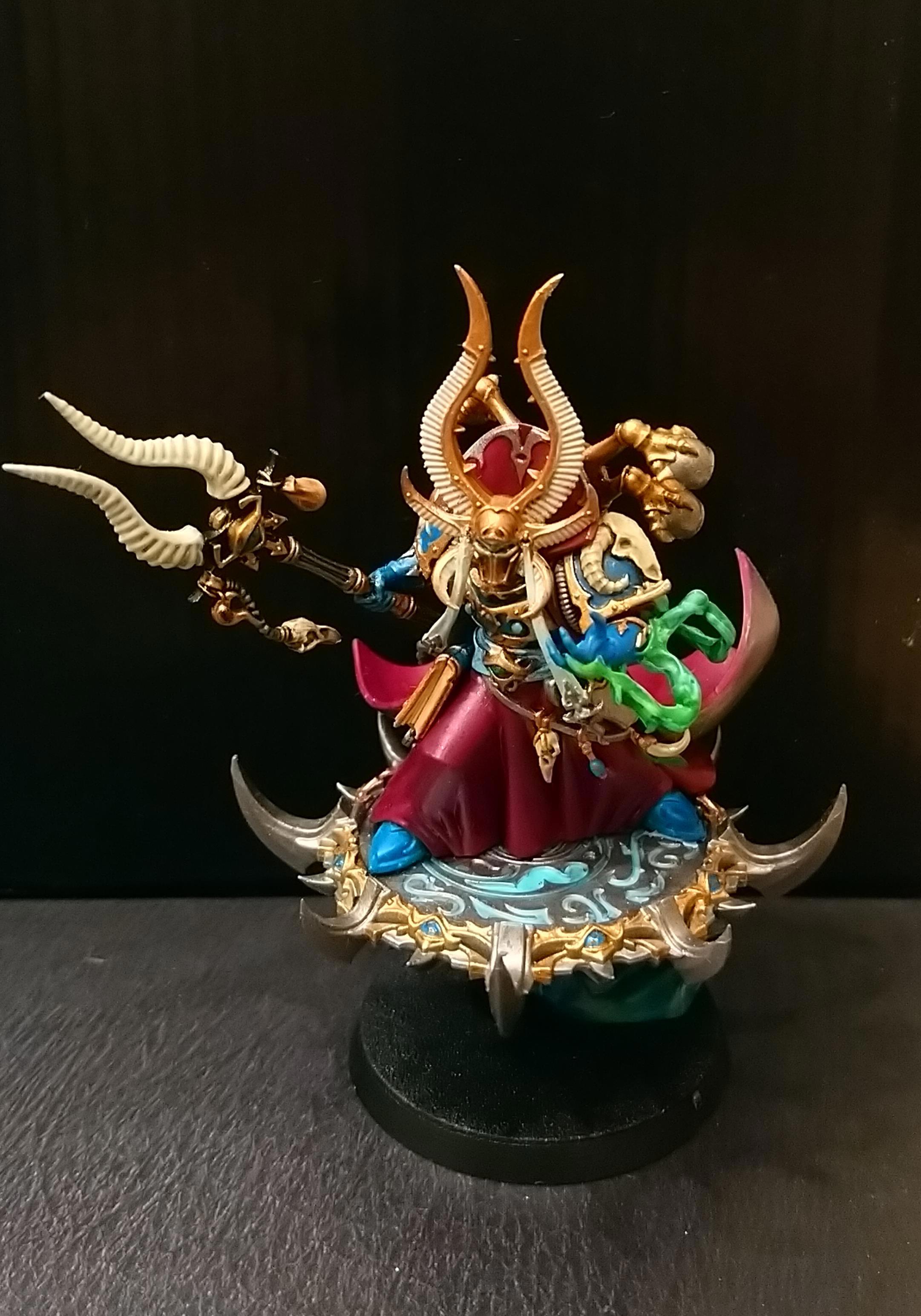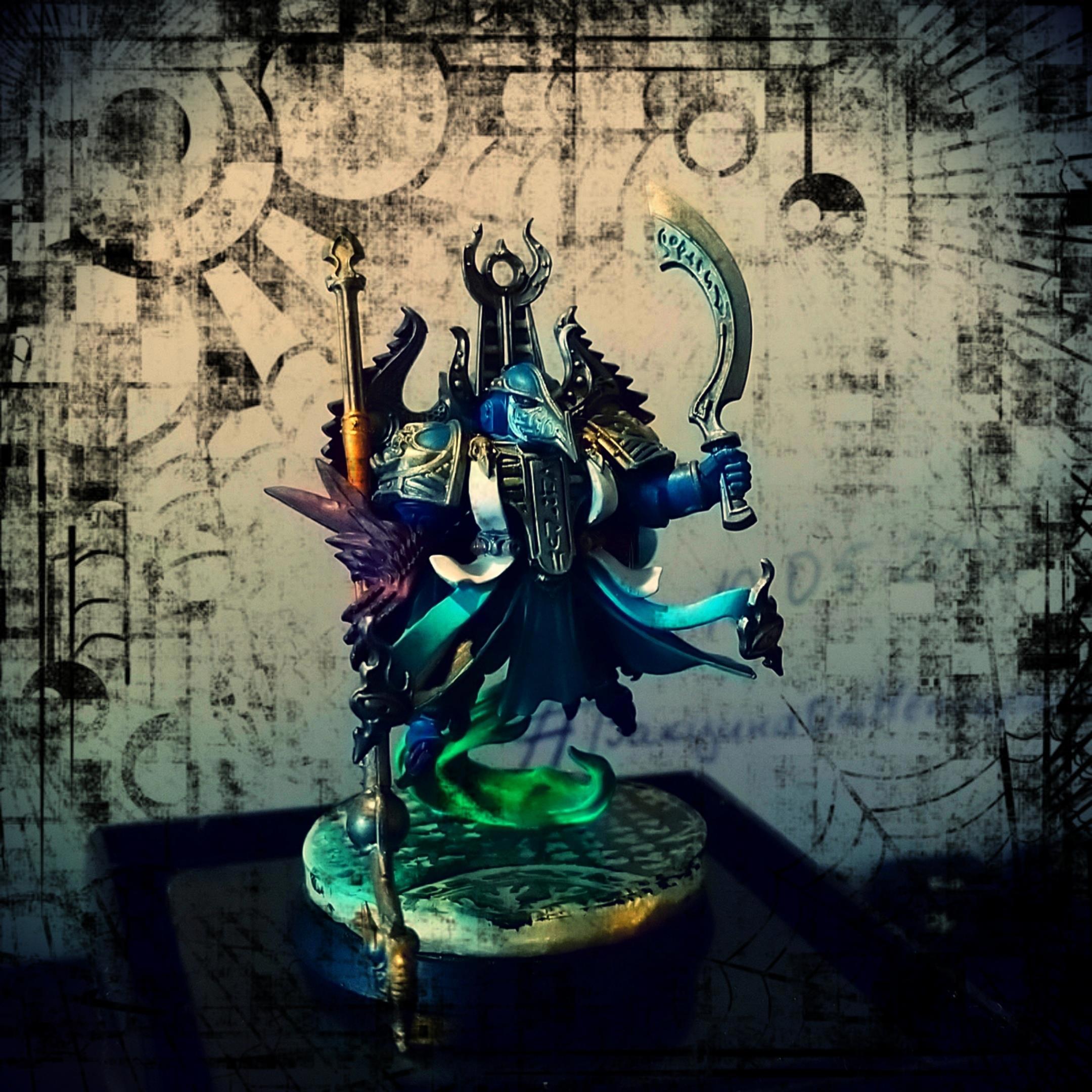 Перевоспитавшийся кхорнит (больше крови богу крови, вот это вот все). Поэтому даже под протекцией эстетствующего Тзинча продолжает обвешивать себя черепами (и шлемами) павших врагов, забывает смывать кровь с оружия (за что бывает регулярно  обруган Айзеком Ариманом). Обладатель фиалковых глаз, шикарной прически с белыми дредами и фамиляра по кличке [цензура]