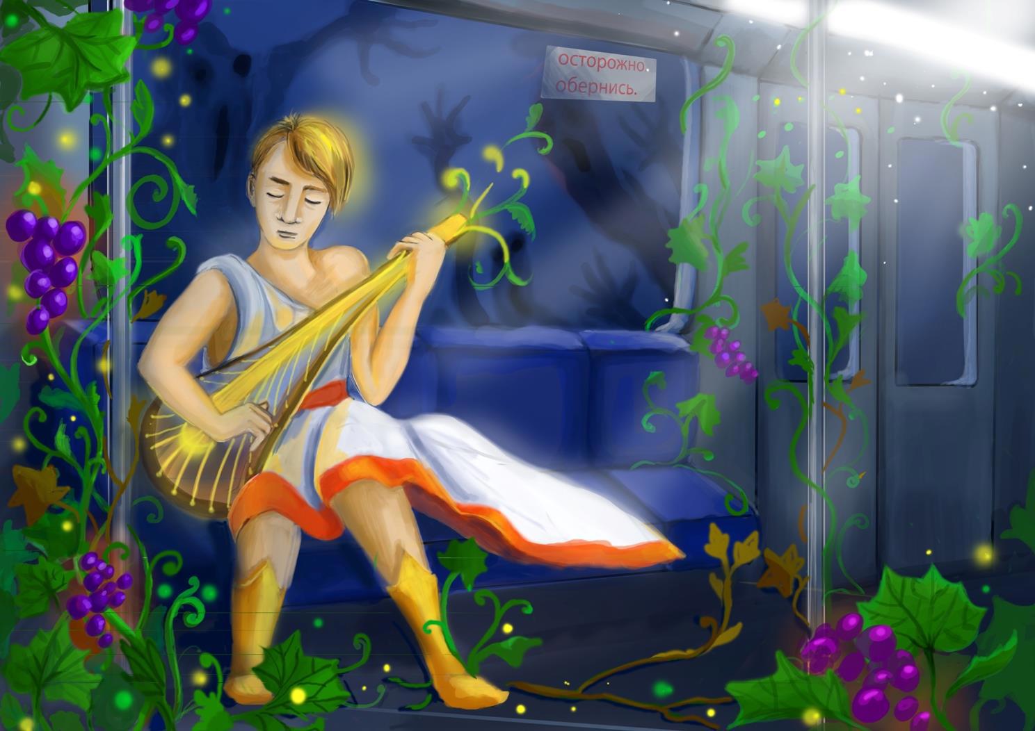 Главный герой сидит в метро, в руках музыкальный инструмент (что-то типа гитары). Глаза у музыканта закрыты. Вокруг него вьется много лоз винограда вперемешку с плющом. Позади окно и за ним видны странные тени. На стекле надпись "Осторожно. Оглянись".