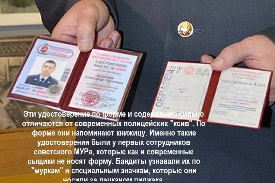 Дорогие сценаристы и режиссеры! Если вы снимаете что-то о Московском уголовном розыске, то знайте: ну не было у них никогда стандартных удостоверений, как у милиционеров. Книжки - "мурки" и точка. Был период (много лет назад), когда всем полицейским решили сделать удостоверения стандартного образца, но вмешался министр Колокольцев, и у оперов теперь "мурки". Об этом писали в "Комсомольской правде". http://www.kp.ru/daily/26141/3031522/ (на фото слева - новые удостоверения, справа - советские и российские, действовавшие до того момента, пока ГУВД не поменяли на ГУ МВД).