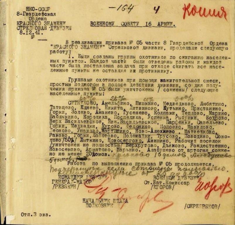 В каждом полку создать команды охотников по 20—30 человек каждая для взрыва и сжигания населенных пунктов, в которых располагаются войска противника".