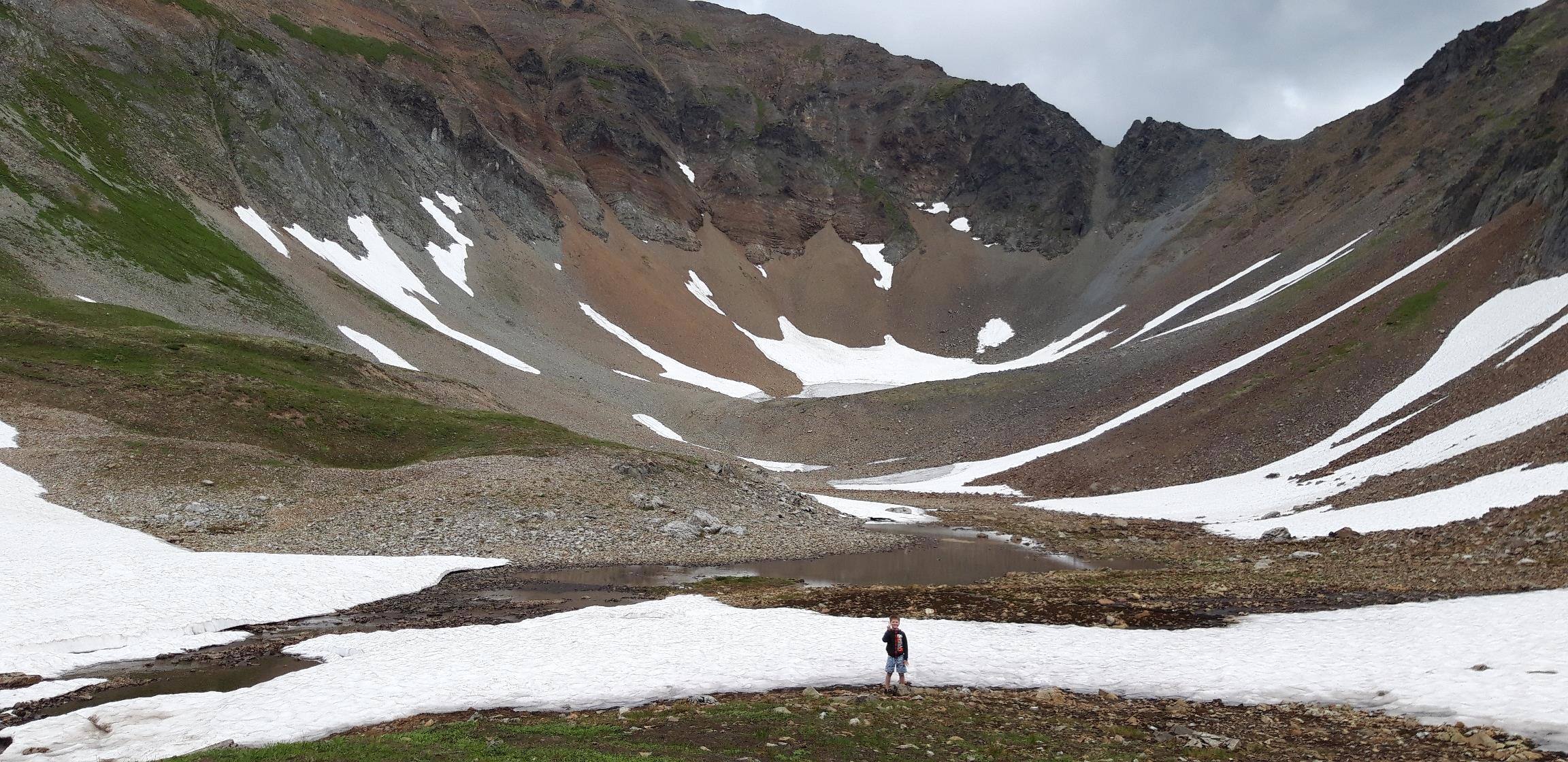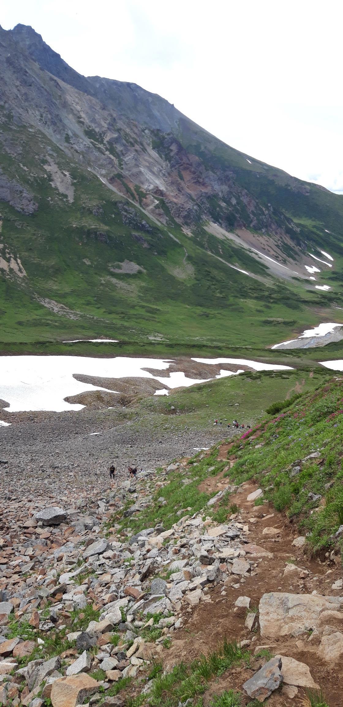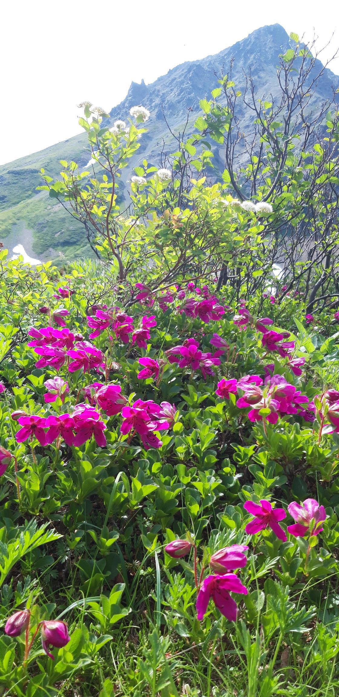 Бежит ручей с чистейшей талой водой с ледников, насыщенный кислородом высокогорья. Ковром стелется тундровая растительность, море цветов. Тропа завалена древними валунами, заросшими разноцветными лишайниками. Тишину режет пронзительный свист евражек, стоит только обернуться на свист, виден убегающий зад суслика с вертящимся, как пропеллер коротким хвостиком. Снег лежит в ложбинах. Величественная гора равнодушно взирает с древней высоты острых пиков.