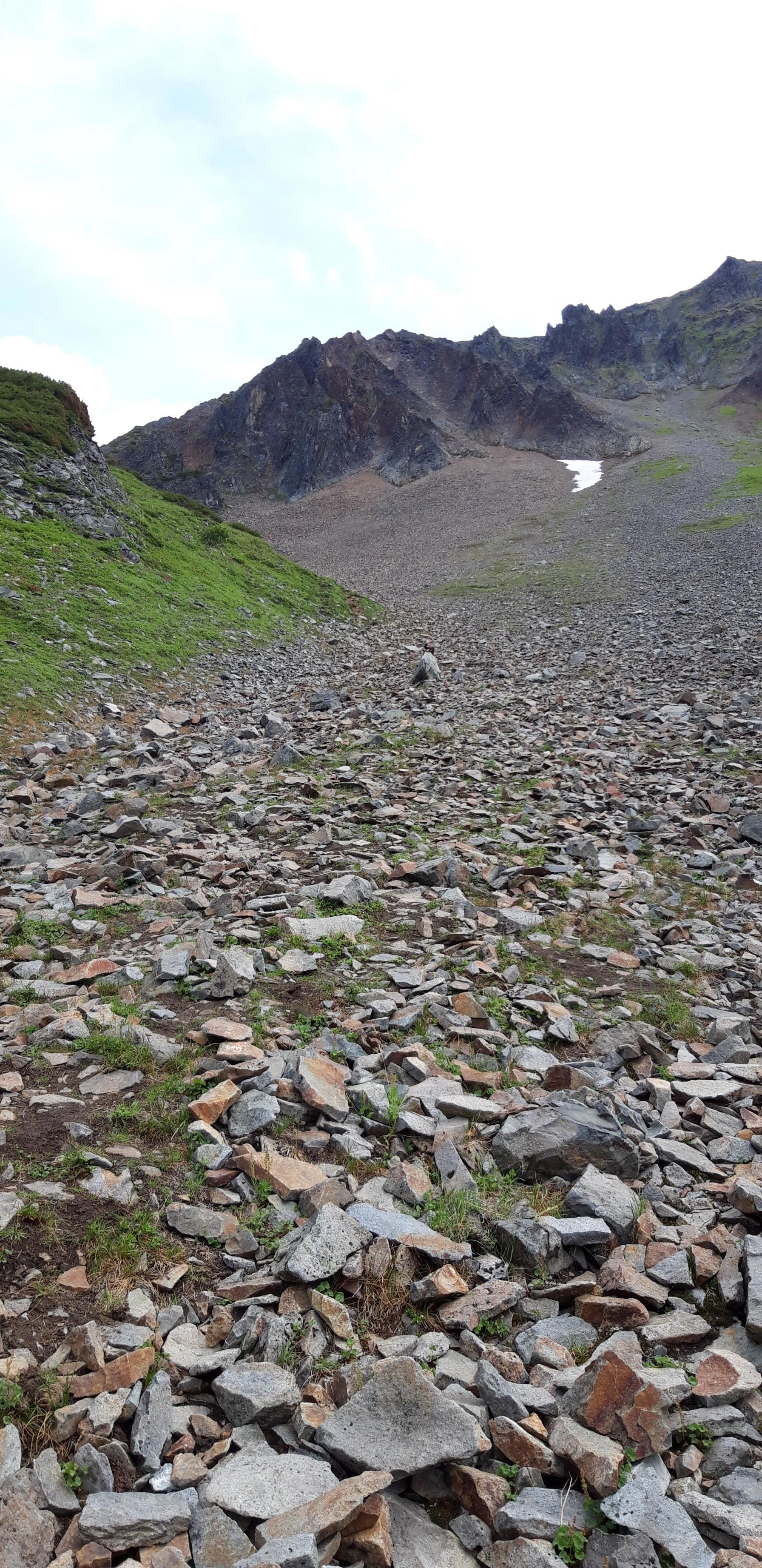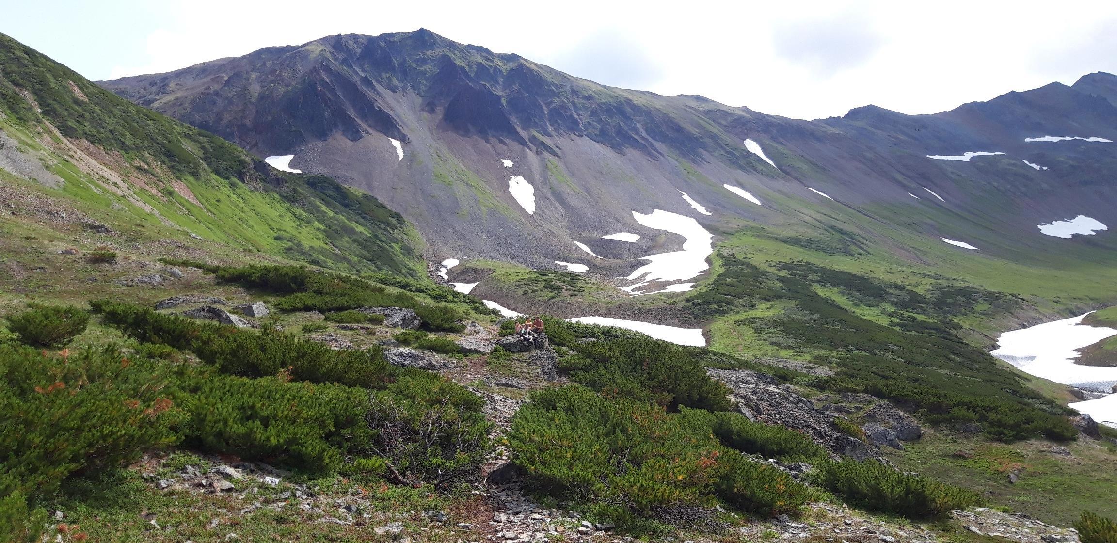 Налюбовавшись пушистиком, идем дальше. Я люблю отстать от группы и остаться наедине. Справа гора с зубцами пиков, слева пологий зеленый склон сопки. За ней малый горный цирк, а нам нужно обогнуть гору, подняться, пройти левее, там нас ждет водопад, а если не испугаться и подняться по насыпи, то попадешь в большой цирк - нам туда.