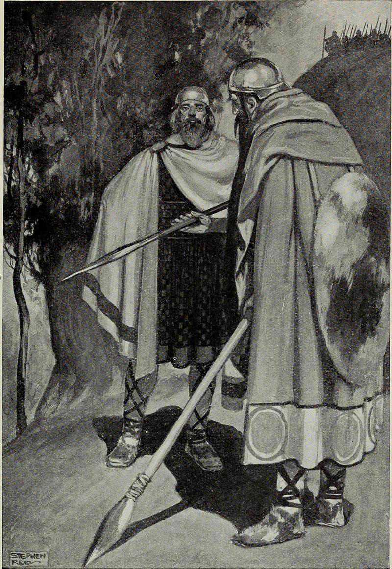 А между тем верховного короля самих Туатов Нуаду вызвал на поединок могучий воитель Фирболгов по имени Сренг. Выехал он на короля, вооруженный тяжелой железной палицей и одним ударом разрубил (расколол? не представляю себе, как можно рубить палицей) щит Нуады и отсек ему руку по самое плечо. Покалеченного короля вынесли из битвы люди могучего Туата Дагды. Правда, королем он после этого оставался уже недолго: по законам ирландцев, увечный не мог править народом. И все же еще успел попонтоваться перед Сренгом еще раз: вождь Фирболгов вернулся и стал вызывать Нуаду на поединок вторично. На что Туат, не дрогнув, ответил, что готов сразиться снова, но только если Сренгу свяжут вторую руку, оставив свободной только одну. Ну, снова-таки, чтобы все честь по чести. Фирболг струсил и от поединка на таких условиях отказался.