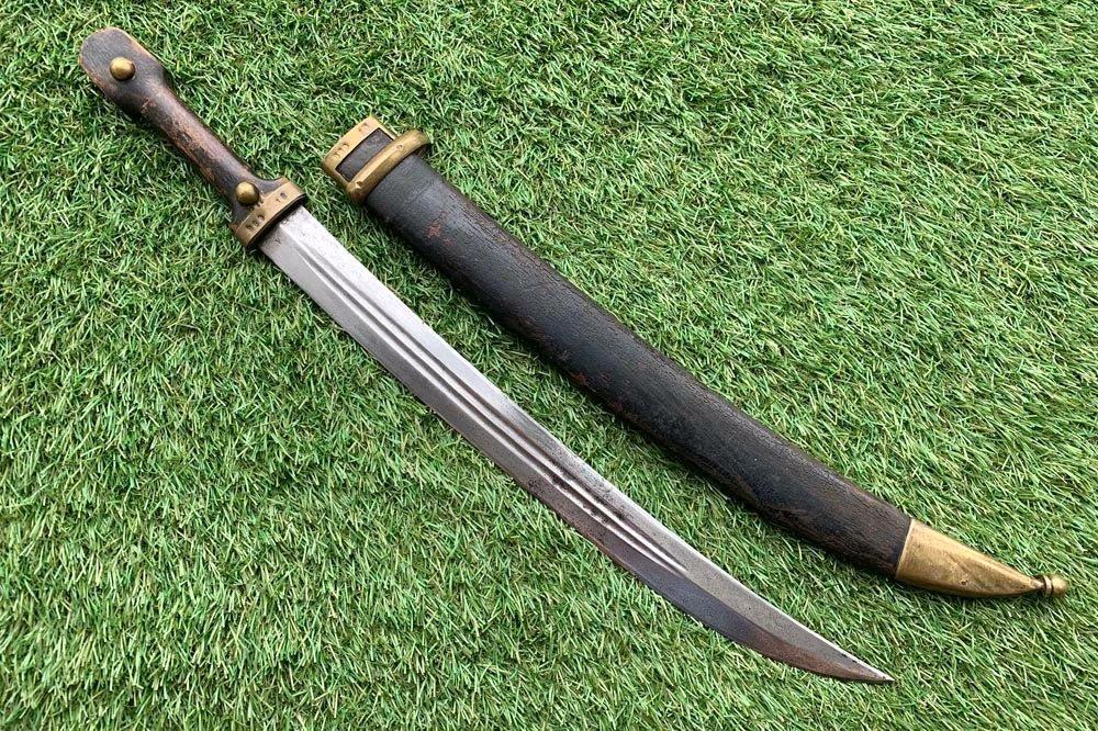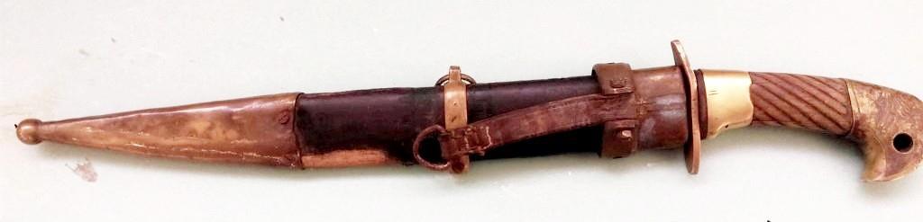 Говорят, и фотографии это подтверждают, что пластуны кривым кинжалам предпочитали прямые. Не ясно, что им в них не нравилось. Попробую предположить, что это происходило потому, что нанести таким кинжалом колющий удар довольно сложно – возникает паразитный вращающий момент из-за несовпадения линии приложения усилия и точкой приложения силы. Иногда казаками в качестве кинжала использовались переделки из сломанных шашек. Типа вот такого образца: