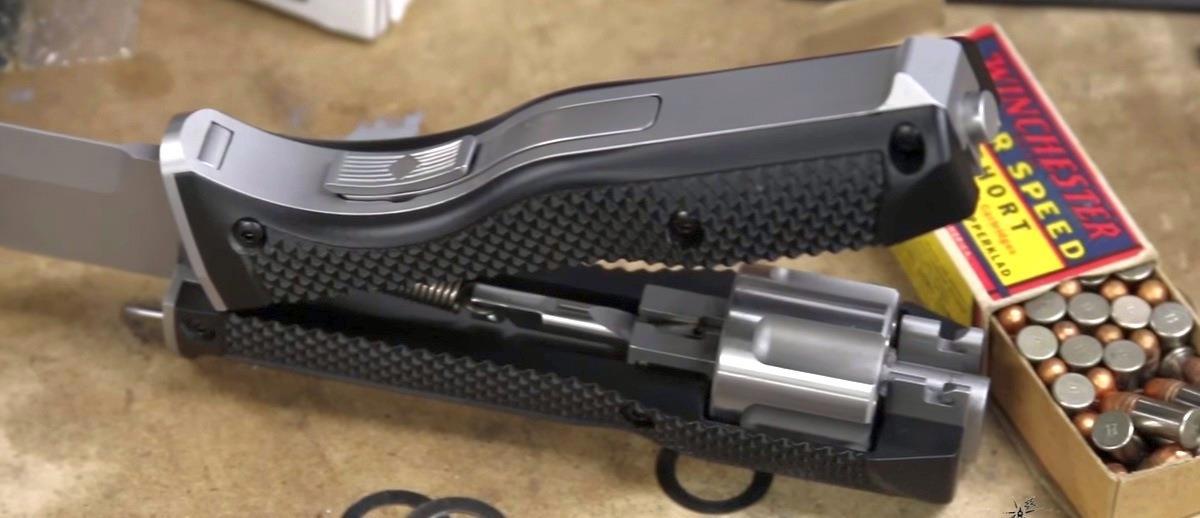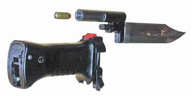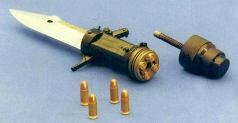 Китайцы ограничились четырьмя зарядами, но помощнее – 7,62х17. Заморачиваться с барабаном тоже не стали, а снабдили каждую пульку своим персональным стволом. Получилось по две штуки с каждой стороны от лезвия. В целом покруче, чем у американцев получилось. Вот здесь понятно, как это зарядить: