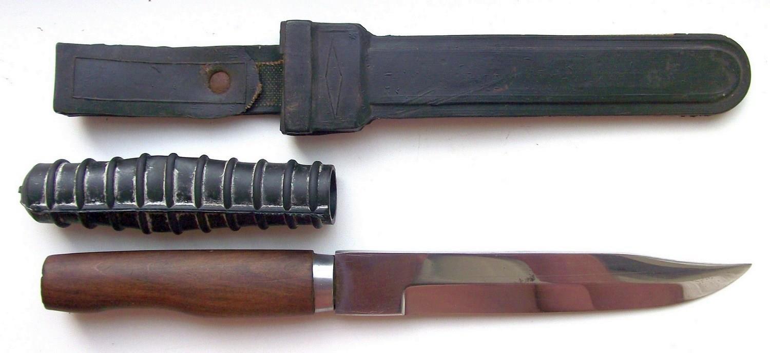 Он дополнительно снабжён резиновой накладкой для рукояти. Вероятно, промышленностью производились по необходимости и другие образцы. И уж точно много ножей для понятных нужд было сделано партизанами во время войны. А уж сколько ножей было изготовлено полулегально на различных предприятиях с металлообрабатывающими станками из сломанных инструментов! Это даже богу и НКВД не известно.