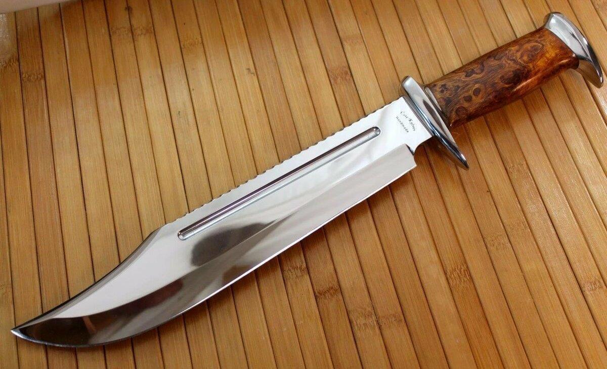 Итак, нож Боуи. Вообще-то Боуи было два брата и сам нож придумал старший брат – Ризон Боуи. Рассказывают душещипательно-кровавую предысторию, которая толкнули старшего Боуи подарить своему баламутному младшему братишке большой ножик, но кто ж сейчас разберётся, что там было, а что высосали из пальца рекламщики? Короче вроде бы факт, что Ризан заказал местному кузнецу Джесси Клиффту сделать для младшего братишки большой ножик. Кузнец взял старый рашпиль и отковал из него простой нож. Этот самый нож Ризон и подарил Джиму Боуи, который с ним и прославился, отправив этим ножом на тот свет сколько-то там граждан США. В зависимости от источника, количество граждан сильно менялось со временем, поэтому цифру не назову. Да это и не важно на самом деле. Ни рисунков, ни снимков ножа не сохранилось. Есть только описание, которое сделал сам Ризон Боуи для газетчиков. Примерно такое: «длина клинка была девять с четвертью дюймов (23,5 см), ширина составляла полтора дюйма (3,8 см), одно лезвие, клинок не изогнут, металлическая гарда.» То есть что-то напоминающее тесак с прямым обухом, односторонней заточкой и крестовиной для защиты руки. Вроде мясницкого ножа. Это всё. Никаких полуторных заточек, никаких долов, никаких лезвий типа «лисичка». Ничего.