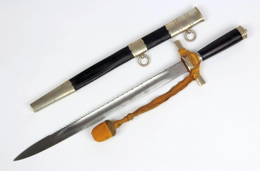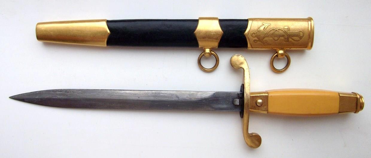 Явной историчностью могут из современных образцов похвалиться только кортики морских офицеров. История появления кортиков в мире сложна и запутана. Одни исследователи выводят её начало из рапир морских офицеров. Другие – из ножей буканьеров. Третьи – из сухопутных видов короткого холодного оружия. Предпочитаю считать, что все по-своему правы. Так или иначе, но впервые кортики в качестве официального оружия морского офицера появились в нашей стране при Петре I. Вооружались кортиками и в других странах тоже. Они отличались во времени и в пространстве по форме, по длине и, уж конечно же – по оформлению. Как-то так получилось, что в некоторых странах кортиками стали вооружать членов дипломатического корпуса, а потом и других чиновников. Докатилась сиё поветрие и до Российской Империи. Сначала кортиками вооружили авиаторов. Вроде бы нормально – всё же это флот, хоть и воздушный. Вот такой кортик образца 1914 года: