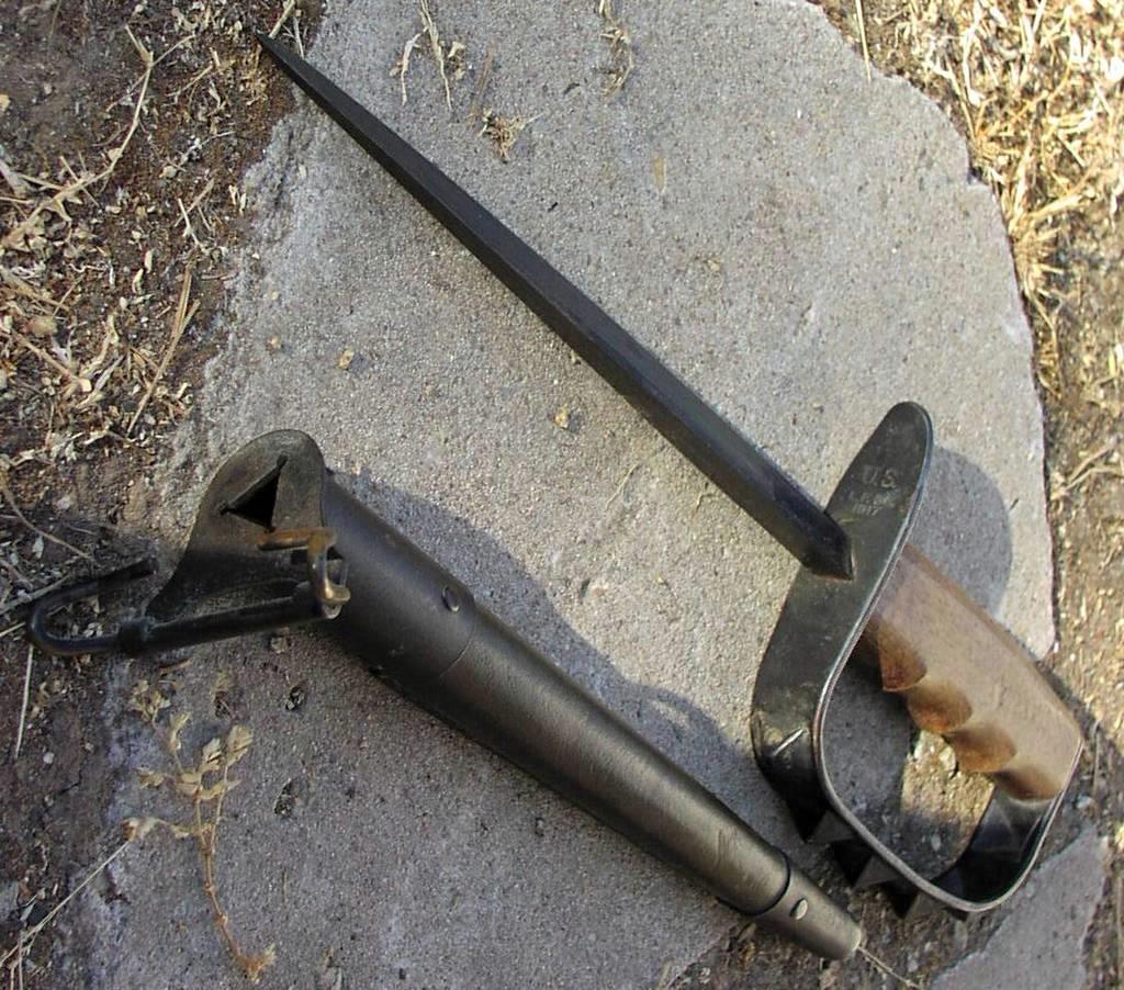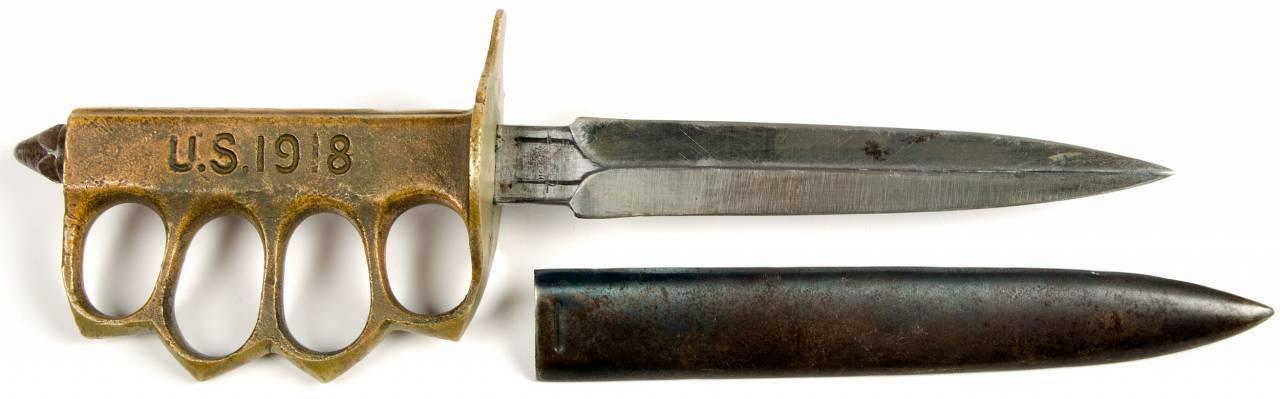 На суше между тем в начале 20 века с ножами происходили очень занимательные вещи. Виной тому стала Первая Мировая война. Окопные схватки быстро выявили, что винтовки, которые состояли на вооружении всех стран-участниц для окопных схваток явно были не удобны. Пистолетов было очень мало, а пистолеты-пулемёты ещё и вовсе не появились. Начался творческий поиск на местах. В русской спасались кривыми (штатными) и прямыми (нештатными) кинжалами. Во французской армии поиск масс вылился в так называемый «Французский гвоздь». Просто брали подходящий стальной прут. Один его конец сгибали во что-то отдалённо напоминающее рукоятку, а другой расковывали и затачивали. Немцы с одной стороны постарались найти подходящие тесаки, с другой – приступили к разработке пистолетов и пистолетов-пулемётов. И все использовали, разумеется, штыки и штык-ножи. Американцы как всегда долго сидели за океаном и ждали, куда подует ветер чтобы вовремя появиться, чтобы объявить себя победителями. Сидели не просто так, а следили за событиями. Их наблюдения вылились в разработку вот такого клинка для окопных сражений М1917: