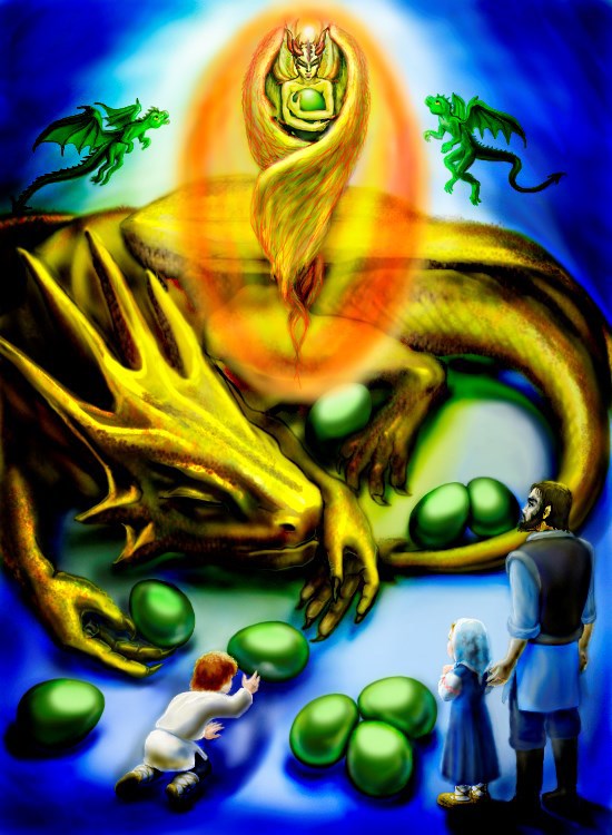 Открыв глаза, я увидела перед собой Лешего. От неожиданности я чуть не выронила драгоценное яйцо, с таким трудом и реанимированное. Лесовик стоял с дочкой на руках. Меж раскатившихся изумрудно-зелёных яиц, корча рожицы своему отражению, ползал любопытный Лешачонок. Вдоль стены уже слегка потускневшей грудой золота лежало огромное высохшее тело дракона.