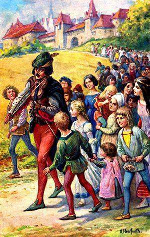Крысолов в отместку властям города Хамельна уводит детей в пещеру. Внимание - играя на скрипке (у Гримм - на дудочке).