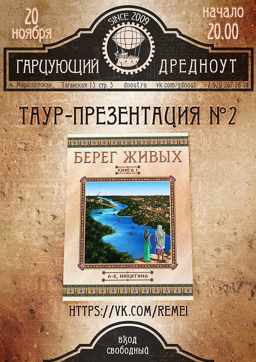 Автор: Анна СештНе могу не похвастаться. Любимый "Гарцующий Дредноут" сделал нам афишу для презентации по Берегу Живых в грядущий понедельник:). Что тут скажешь - приятно видеть себя в списке мероприятий