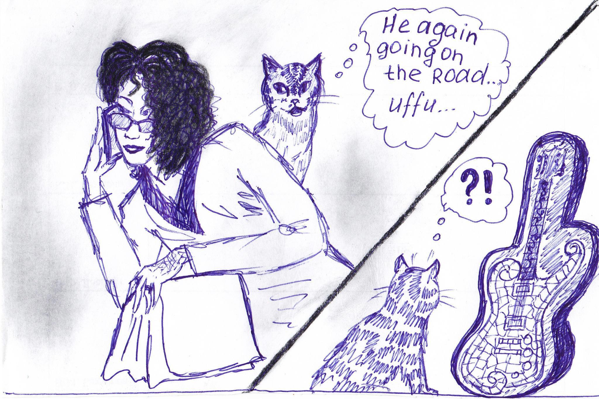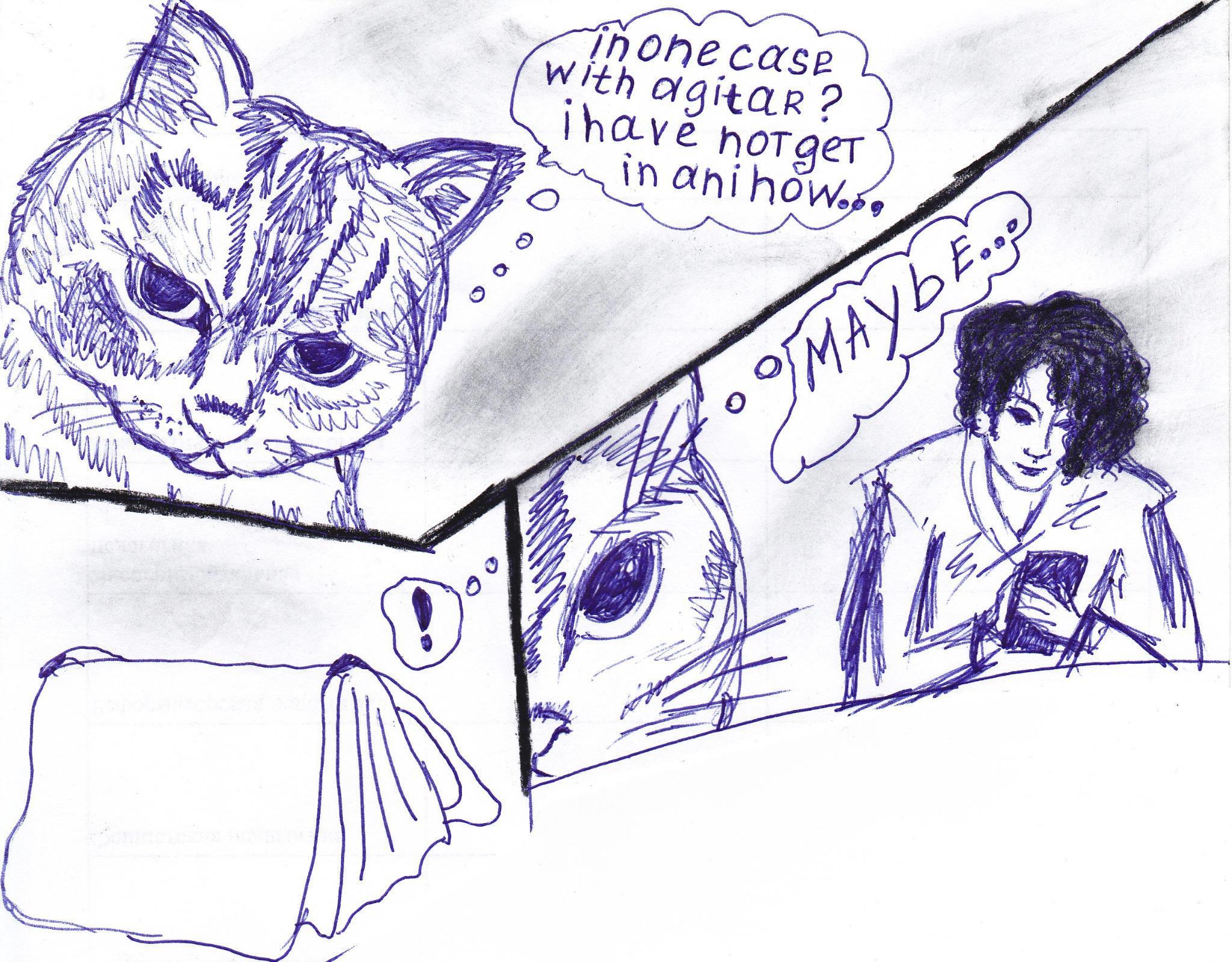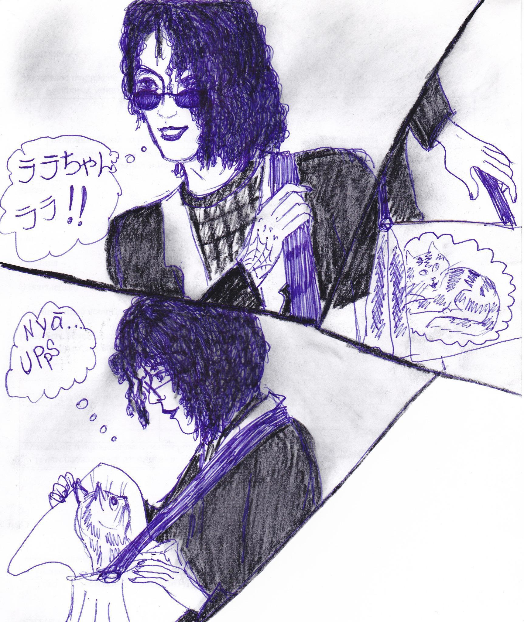 А это что-то вроде комикса. Кодзи собирается на гастроли, а его кошка хочет с ним))) А это уже рисовалось ручкой)