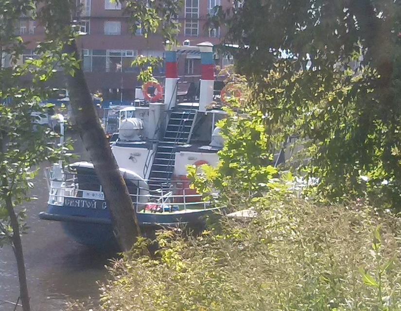 Я пытался подобраться ближе, чтобы сфотографировать больше деталей, но мешает ограда. И зелёные насаждения. И всё же как смог, я кормовую часть сфотографировал. Тут интересная особенность как проходят трапы. Вернее трап - он один, достаточно широкий и по центру. Очевидно, чтобы кавалеры с дамами могли идти по нему парами под ручку.