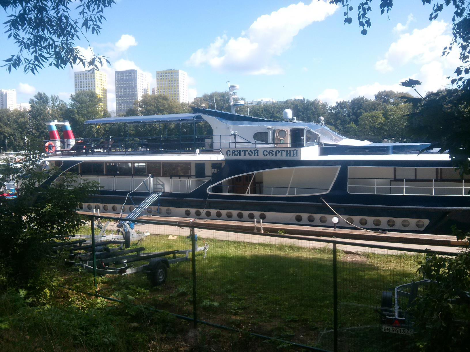Переделке подверглась его носовая оконечность - её удлинили, чтобы придать стремительность очертаний как у современных моторных яхт. Вышло не хуже, а может и лучше. Кроме того, при переделке в подводную часть врезаны подруливающие устройства, как на современных моторных яхтах. Без них "Святой Сергий" не смог бы зайти в не такое уж широкое устье речки Химка, которое и образует залив - стоянку. Причём "Святой Сергий" имеет довольно приличную длину, так что хотя канал в районе Химок и довольно широк (около 100 м) но при совершении манёвра входа "Святой Сергий" вынужден разворачиваться поперёк канала - и фарватер он перекрывает полностью в это время. Корабль имеет не только приличные размеры, но и водоизмещение, так что каждый его вход на эту стоянку это операция очень неспешная. Примерно четверть часа уходит пока он пришвартуется к пирсу.