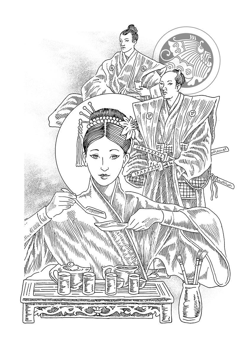 Когда первый всадник возник в ярком круге света от факелов, окружавших площадь, и праздничных фонарей, я смог рассмотреть его как следует. Двуцветное кимоно, черное с голубым. За спиной бьется на ветру накидка тех же цветов. Витые красные шнуры затянуты под подбородком. Иначе нельзя удержать на голове шляпу: круглая тулья, загнутые поля, наверху пушистое перо цапли.