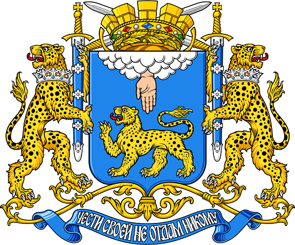 И на гербе его все тот же «зверь лют», и все та же благословляющая «длань Господня», и два барса в щитодержателях, «увенчанные по плечам венцами св. Довмонта в виде серебряных, украшенных лазоревыми камнями, обручей».