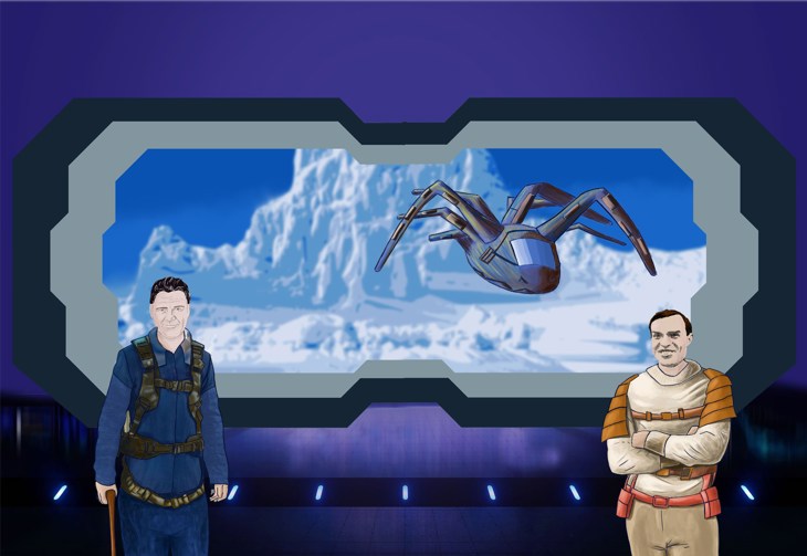 Космическая база на Европе - мире льда и северных сияний. Полупрозрачные стены и потолок комнаты. Задний план - иллюминатор с видом на ледяную панораму Европу и парящий над ней звездолет-паук. На перед нем плане: слева, опираясь на трость стот сгорбившись старик-ветеран-косморазведчик (описание его выше) , справа - молодой ГГ с надменно скрещенными на груди руками. обо - в полоборота смотрят на звезды и звездолет. Первый с тоской и безнадегой, второй - с наивным восхищением и азартом в глазах.