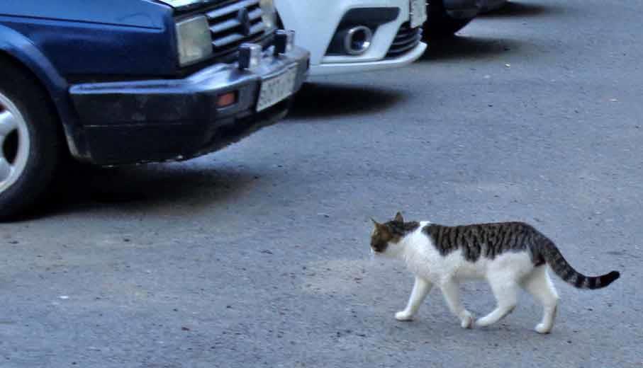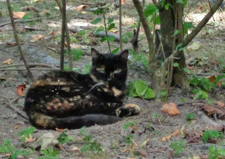 Кошка лежала далеко, не хотелось тревожить. Её окрас оказался в гамму окружающему пейзажу. У неё глаза такого же цвета, как живые листья, а пятна - как листья высохшие.