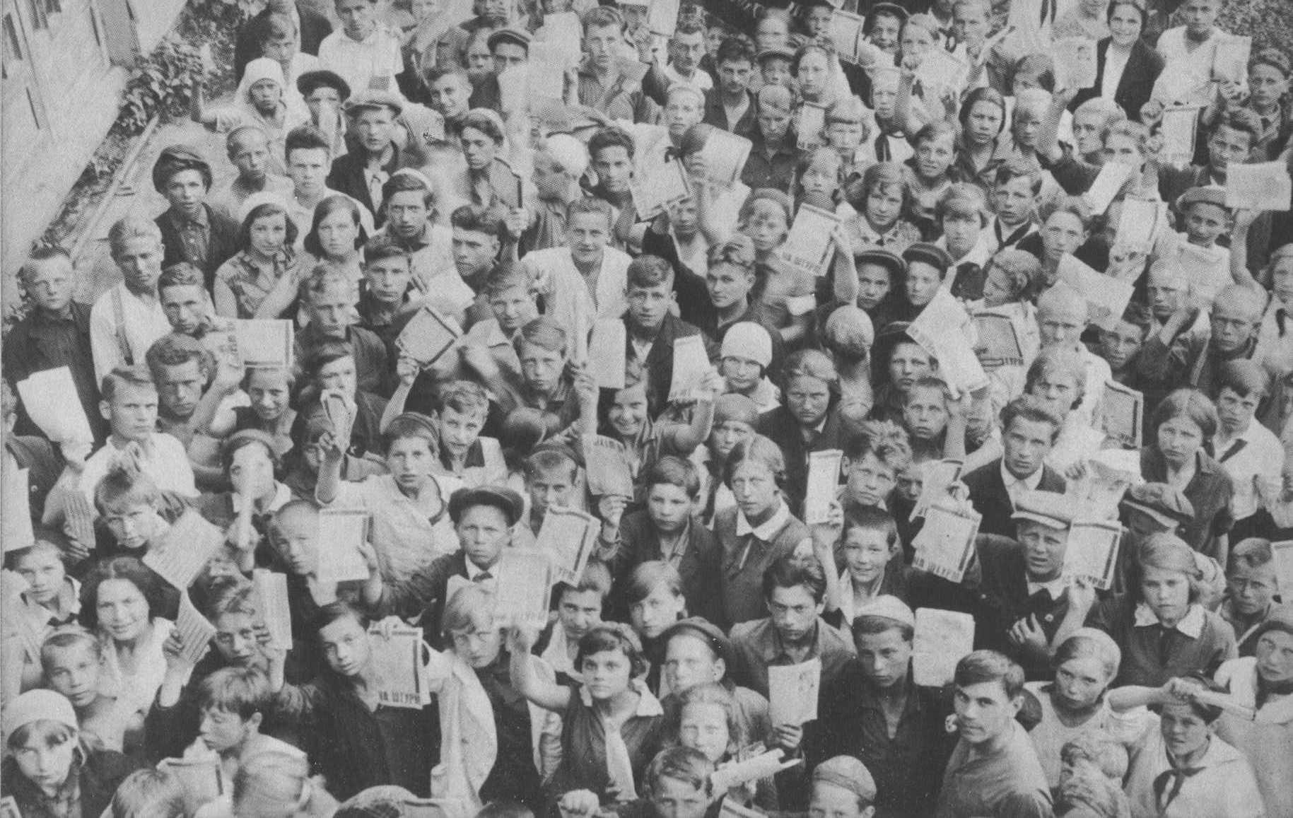 Пионеры, организованные продавать облигации госзайма для второй пятилетки. Подписка, конечно, добровольная, но пусть небеса помогут тому, кто не купит хотя бы одну.