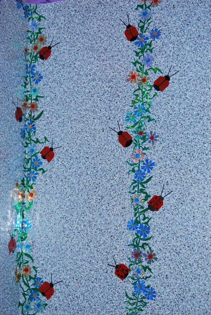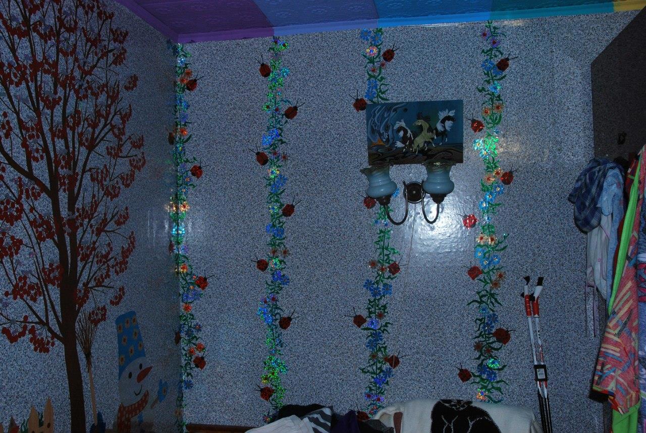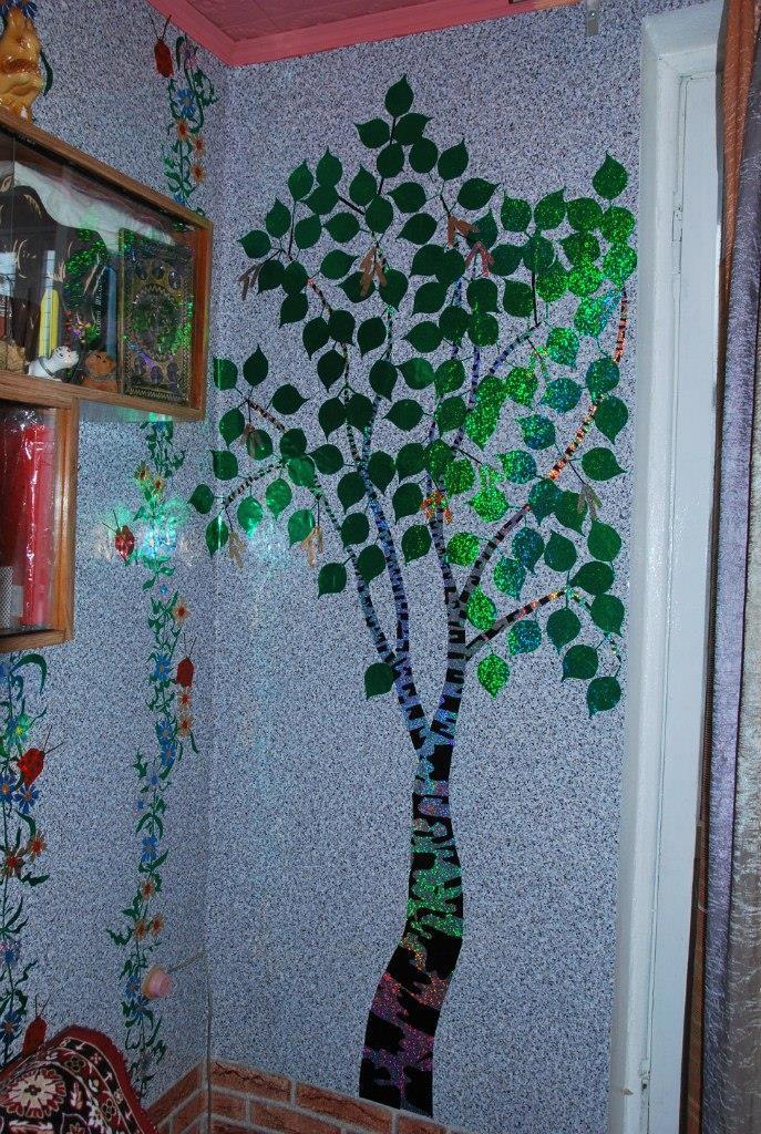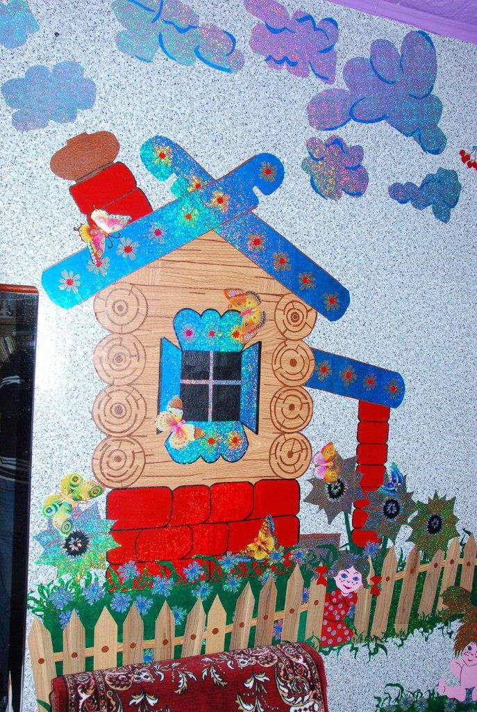 Ну, я и рванула оформлять с помощью голографических самоклеющихся обоев разного цвета.