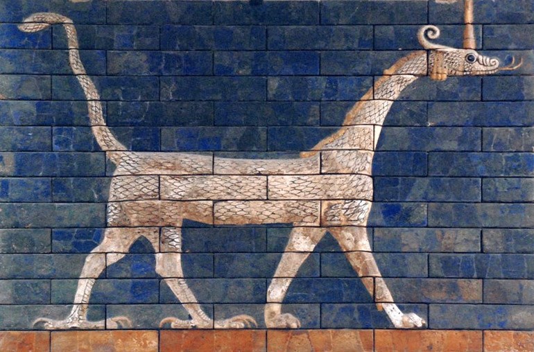 А вот картинка из Вавилона … богиня Иштар. Помните? Эта картинка даже в учебнике школьном была. И зверя этого я помню. А в других книжках даже его имя называли – Сируш. Кто у нас спец по зверушкам подтвердят – такой породы на Земле нет. Тогда откуда сей образ? Кстати он немного похож на флаг Тартарии, но без крыльев. Совпадение?