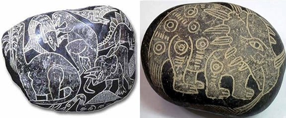 Всё это так, и всё же… а вдруг? И ведь если посмотреть повнимательнее вокруг, то поводы для сомнений таки есть у нас! Про один такой повод я уже тут писал как-то. Называется он среди любопытных под кличкой «камни Ики». Они, эти камни, если помните, все со странными картинками, среди которых и динозавры есть. Вот такие они: