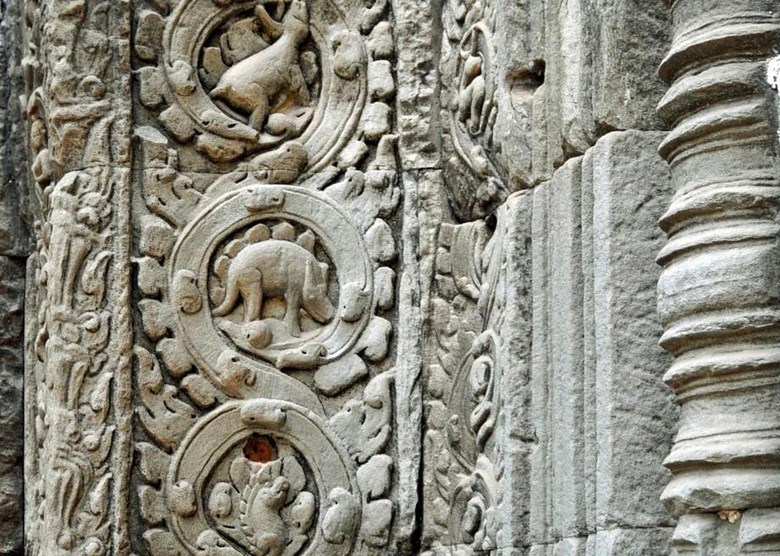 А вот и Ангкор из Камбоджи, об который все уже зубы сточили на предмет, кто и когда построил это суперсооружение. Но я не про это, а про вот эти маленькие фигурки на стенах одного из сооружений под названием Та Прум. Вот эти самые спецы палеозоологи уже опознали в них своих подопечных. И так уверенно говорят: «стегозавр» и «гиракодонт». Правда этот самый гира… не динозавр, а разновидность древнего носорога, но тот помер 20 млн. лет назад – тоже не слабо звучит.