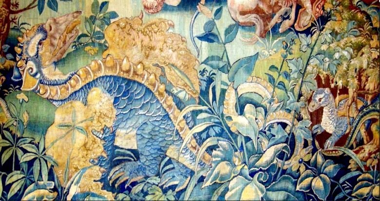 Может у европейцев с фантазиями похуже? Отнюдь. Вот это гобелен из французского замка Блуа с милой парочкой мамы-динозавра и детёныша-динозавра: