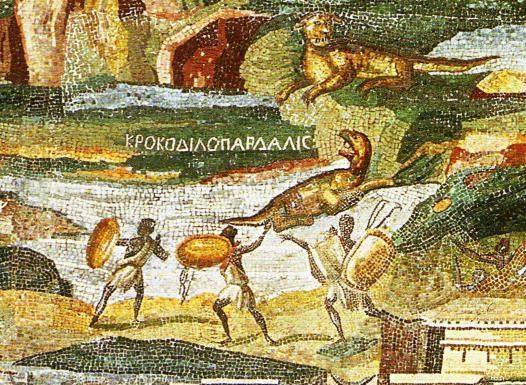 Ладно – это всё слова. А теперь посмотрим. Вот, например, «нильская мозаика». Она хороша тем, что здесь не только нарисовали, но и написали, если что не ясно, да ещё и на русском… ой, это же «древние греки» писали… неважно. Всё понятно без перевода. Но если кто не слышал о «ловчем звере пардусе» из летописей, то переведу. Здесь написано «крокодил-геперд». То есть такой крокодил, который бегает по пустыне и даже цвет у него вполне под песок с камнями. Динозавр? Может быть, хотя по мне – больше напоминает о варанах.
