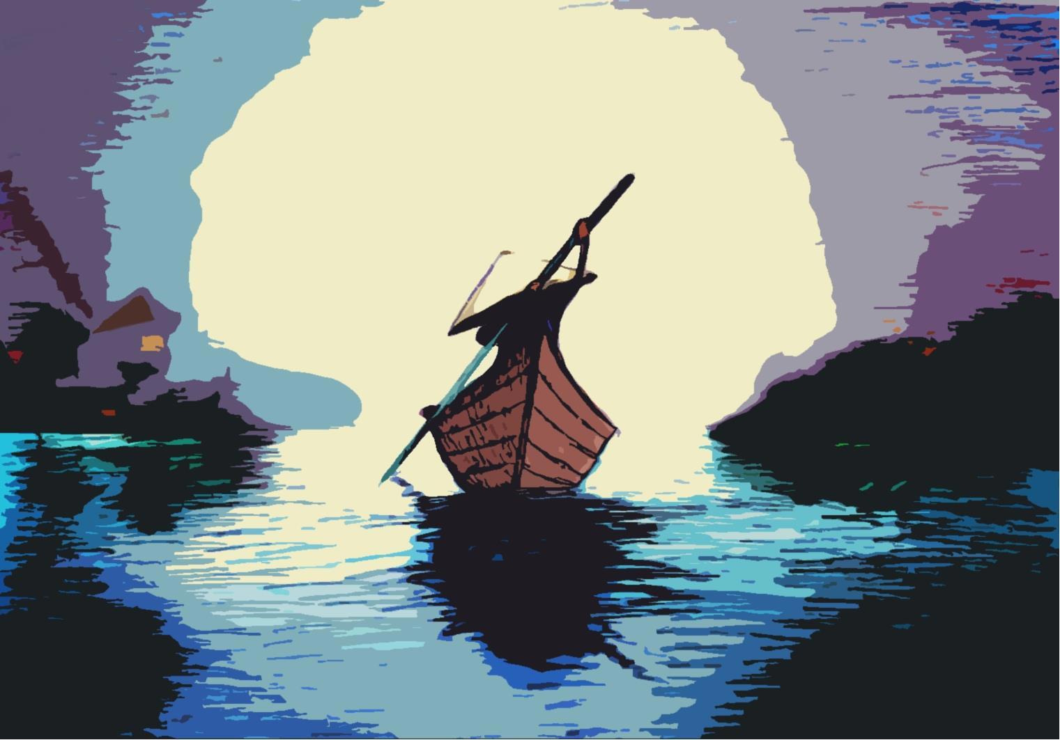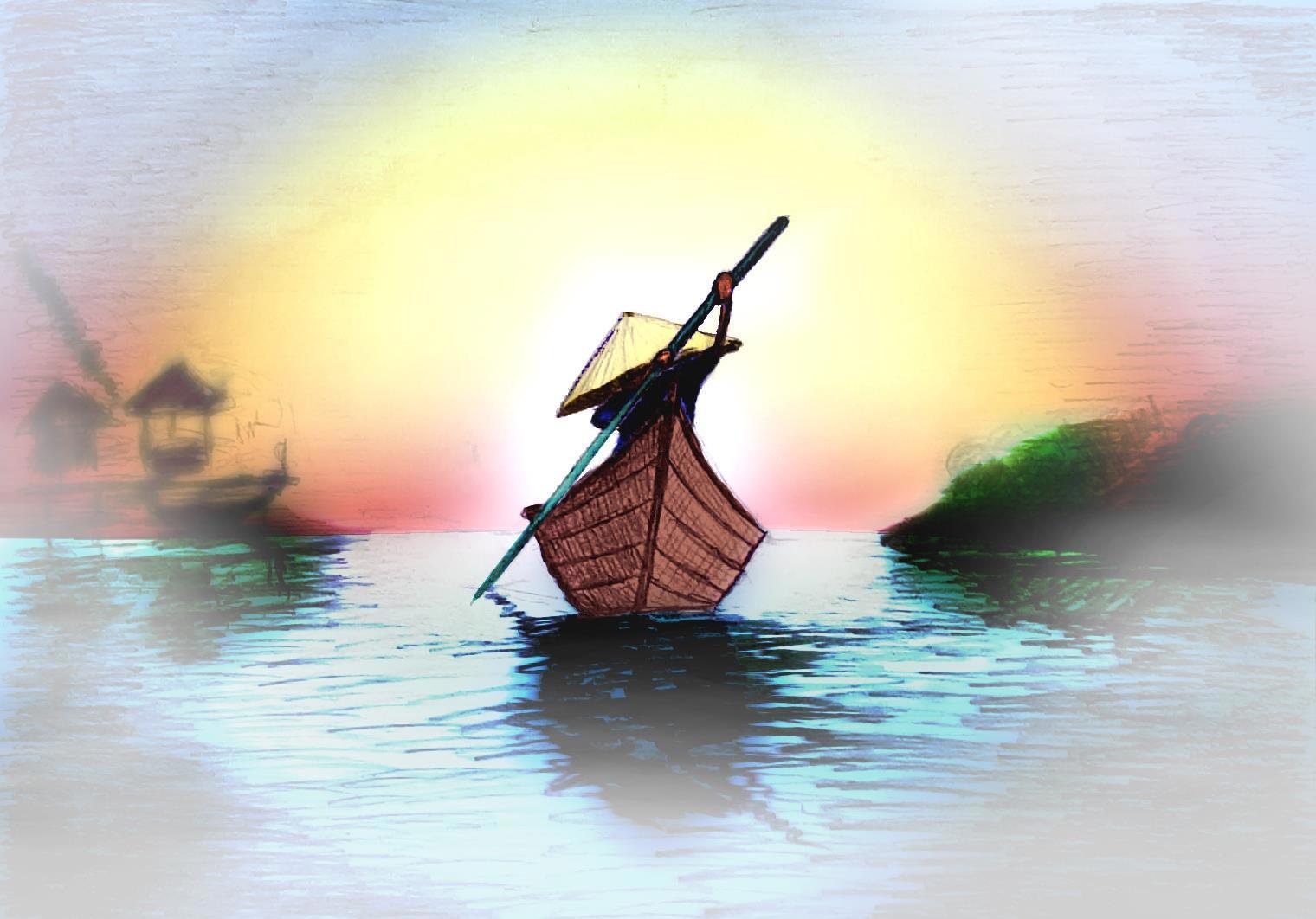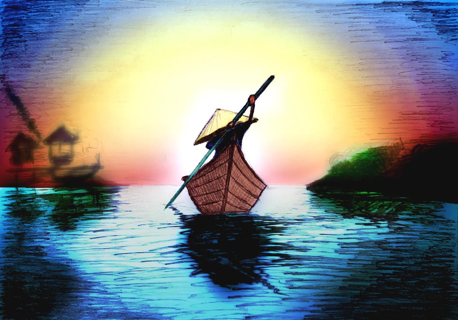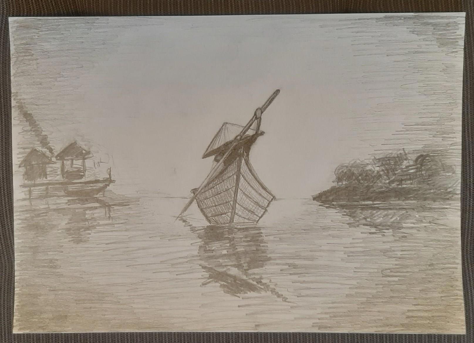Всё как обычно, учусь, рисуем коробочки и шарики, тени, свет, всё изучаем и вдруг захотелось мне сваять чего-то не кубиковое. Фантазия прёт, море по колено, карандаш - весло и получилась у меня вот такая картинка: https://author.today/art/20236