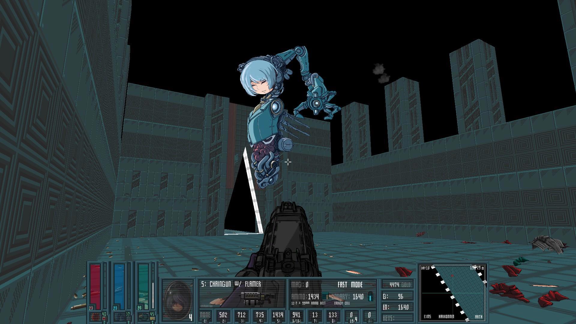 Уровни так же не блещут разнообразием и выполнены в одной цветовой палитре. Но с моей точки зрения это превращает игру в этакий Blame! с его мрачняком. Но во время перестрелок на окружение не особенно то и отвлечёшься, если ты не Ваномас какой-нибудь, тем более когда есть Боссы. Да, они однообразны, просто большой спрайт стреляющий в тебя из всех щелей, но