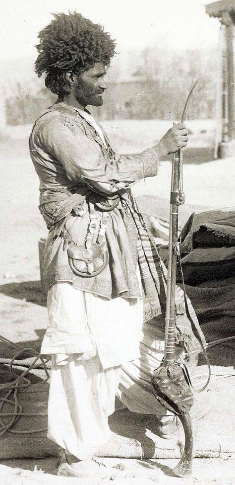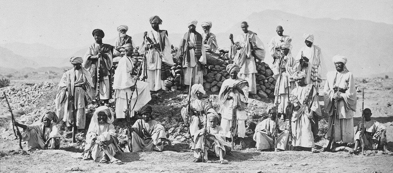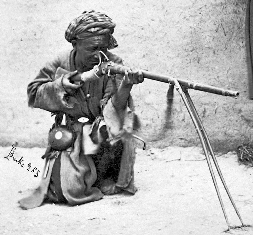 Стройные ряды и колонны английских войск в горах сталкивались не с другим строем, а вот с бородачами, вооружённым длинными ружьями. Иногда даже фитильным, как на вот этом фото:
