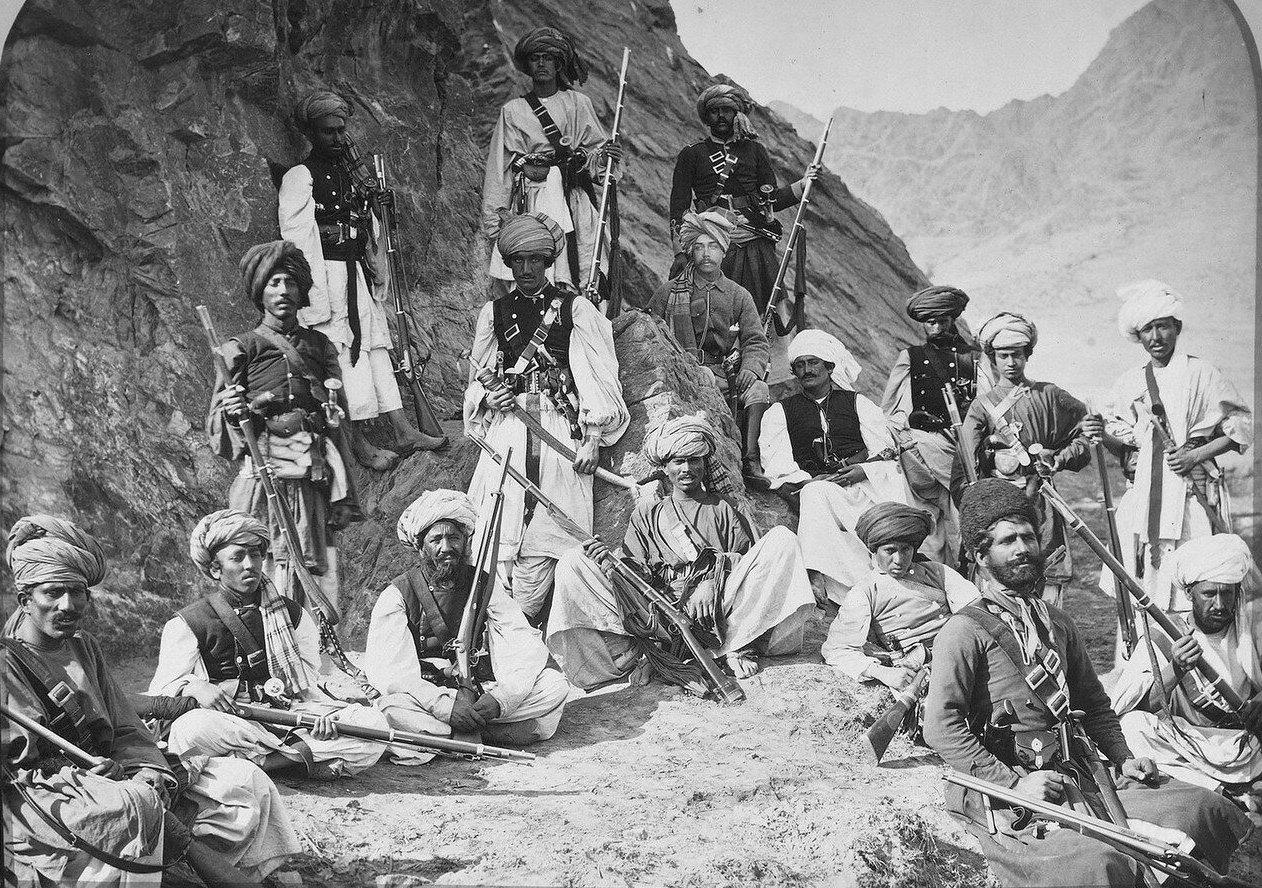 У афганцев ситуация совсем другая – они тоже воины, но плотные боевые порядки для них не характерны – их в горах особо негде строить. А вот дальность точного выстрела – совсем другое дело. Это очень важно. Отсюда прямо вытекает обилие у афганских бойцов длиннющих ружей (до 1,7 метра). Скорострельность им тоже особо без нужды. Стрельба велась из засад. Выстрелил – ушёл. Часть афганцев англичане переманили на свою сторону. Естественно платили. Естественно снабжали. И уж само собой – вооружали. Однако, посмотрите на это фото. Что там в руках у афганцев? Есть короткие карабины, но есть и длинные ружья:
