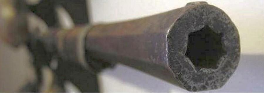 Я упомянул, что среди «карамультуков» часто встречались нарезные образцы. В условиях плохо оснащённых мастерских это непросто. Отсюда вопрос – как? Один из вариантов технологии изготовления таких винтовок описывает исследователь этого оружия Пётр Сердюк в своих статьях. Вот его описание (не знаю, насколько оно верно): «… стволы этих винтовок изготавливались следующим способом: в кузне выковывался прут с шестигранным сечением по размеру калибра. Вначале он подвергался калибровке, после чего по концам зажимался воротками. Двое человек скручивали его вдоль продольной оси. Нюанс упомянутой операции был в том, что в конце комбинации по скручиванию и одновременно растягиванию получался абсолютно ровный витой прут. После чего его проковывали и навивали железную полосу. Такие манипуляции позволяли, удалив прут, получить идеальный ствол с полигональными нарезами.»