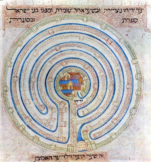 Ещё одна традиция христианская это лабиринты типа «Иерихон». То есть обычно это обычная картинка с изображением обычного лабиринта, но в центре нарисован «город». И говорят, что это — изображение города Иерихон. Лабиринты-Иерихоны бывают как круглые, так и квадратные. Причём такое изображение идёт ещё с римско-католической и иудейской традиции. Интересная такая картинка... я ещё к ней вернусь.