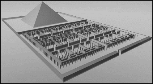 Строили лабиринты и в Египте. Самый крупный, если не сказать «грандиозный», был недалеко от Каира. Датируется 2,5 тыс. годами до нашей эры. Это здание общей площадью 70000 квадратных метров, из которых половина в подвале. В полутора тыс. помещений в нём хранились мумии священных крокодилов. Вот его реконструкция: