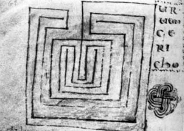 Иногда в рукописях Иерихоном называют сам лабиринт. Вот такой рисунок. Особенно интересно, что рядом с ним изображён ещё и солнцеворот, который тоже вообще-то к христианству никаким боком не лежит: