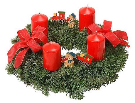 В первое воскресенье адвента мы кладем на стол специальный венок, сплетенный из еловых веток, он так и называется: венок адвента. На венке закреплены 4 свечи и 4 ленточки, но могут быть и другие украшения. В нашей семье свечи всегда белые, а ленточки красные – это семейная традиция. Во времена германской оккупации во время второй мировой войны так датчане выражали свой протест против фашизма: цвета свечей и ленточек вместе образуют красно-белый датский флаг, Даннебро. Вот так выглядит венок (только тут свечи красные):