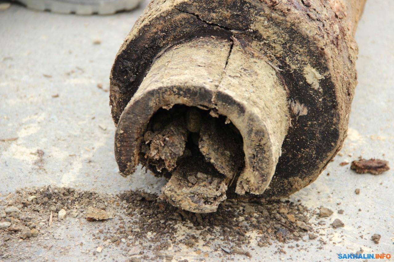 Так вот там откапали реликтовые трубы эпохи Карафуто - деревянные! В хорошем состоянии! Только поглядите, их нашли на глубине 1-1.5 метров и они использовались по назначению. Они были действующие! Снабжали водой несколько рядом стоящих домом... Как? Уже никто и никогда видимо не узнает...