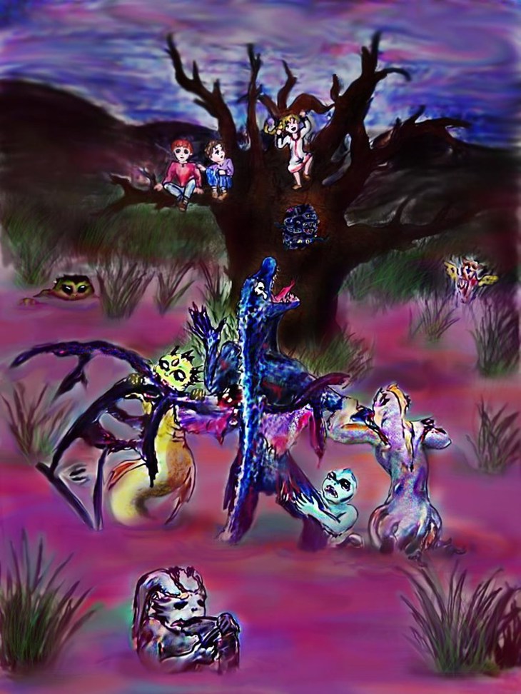Это моя иллюстрация "Остров", где змей приближается к заветной цели - обладанию своей армией, лежащей пока что в пелёнках на дне Улиной корзинки. А навстречу ему выплывают защитники - бывшие земляне, попавшие при переходе на эту планету сразу в Припять.